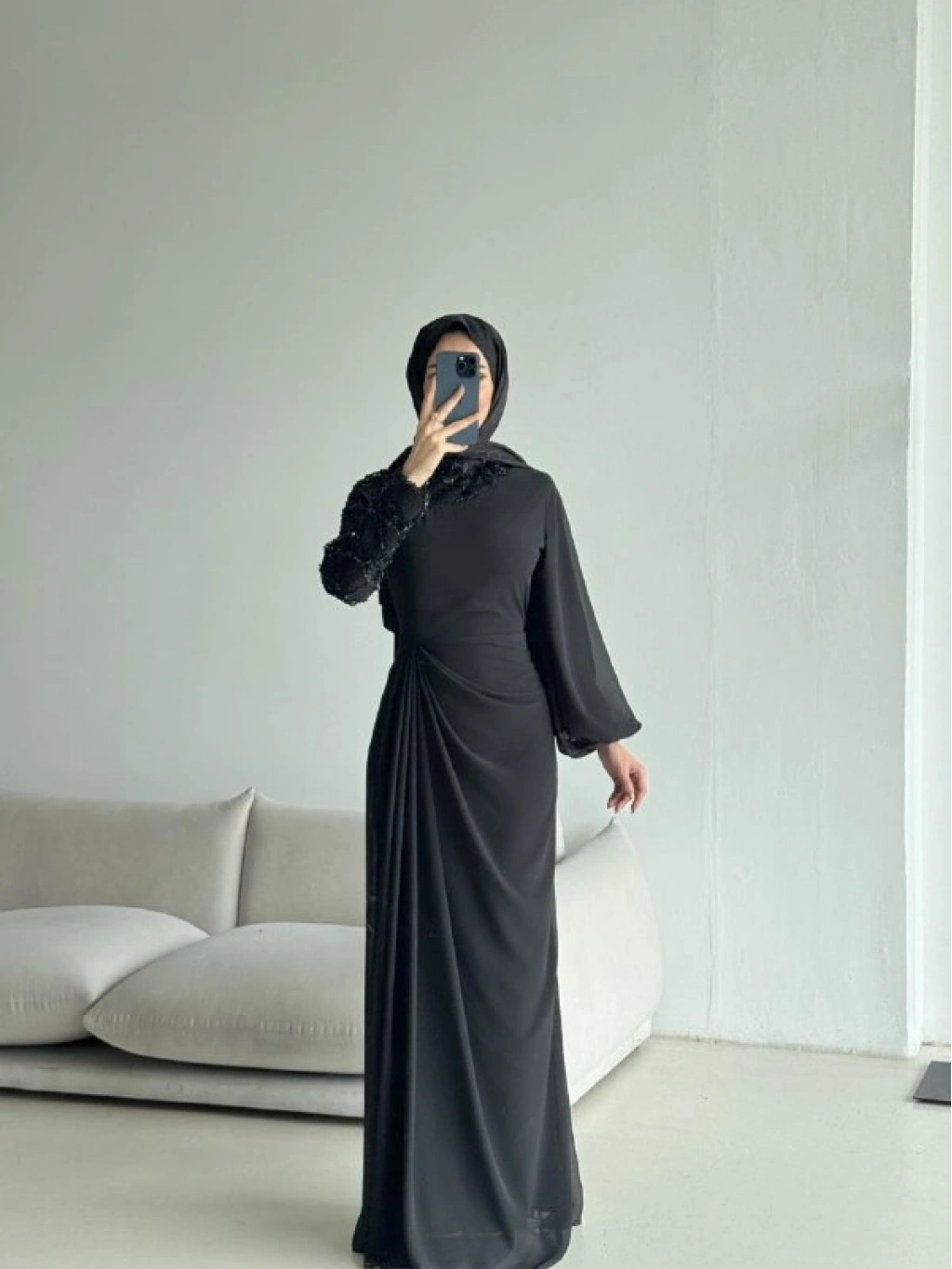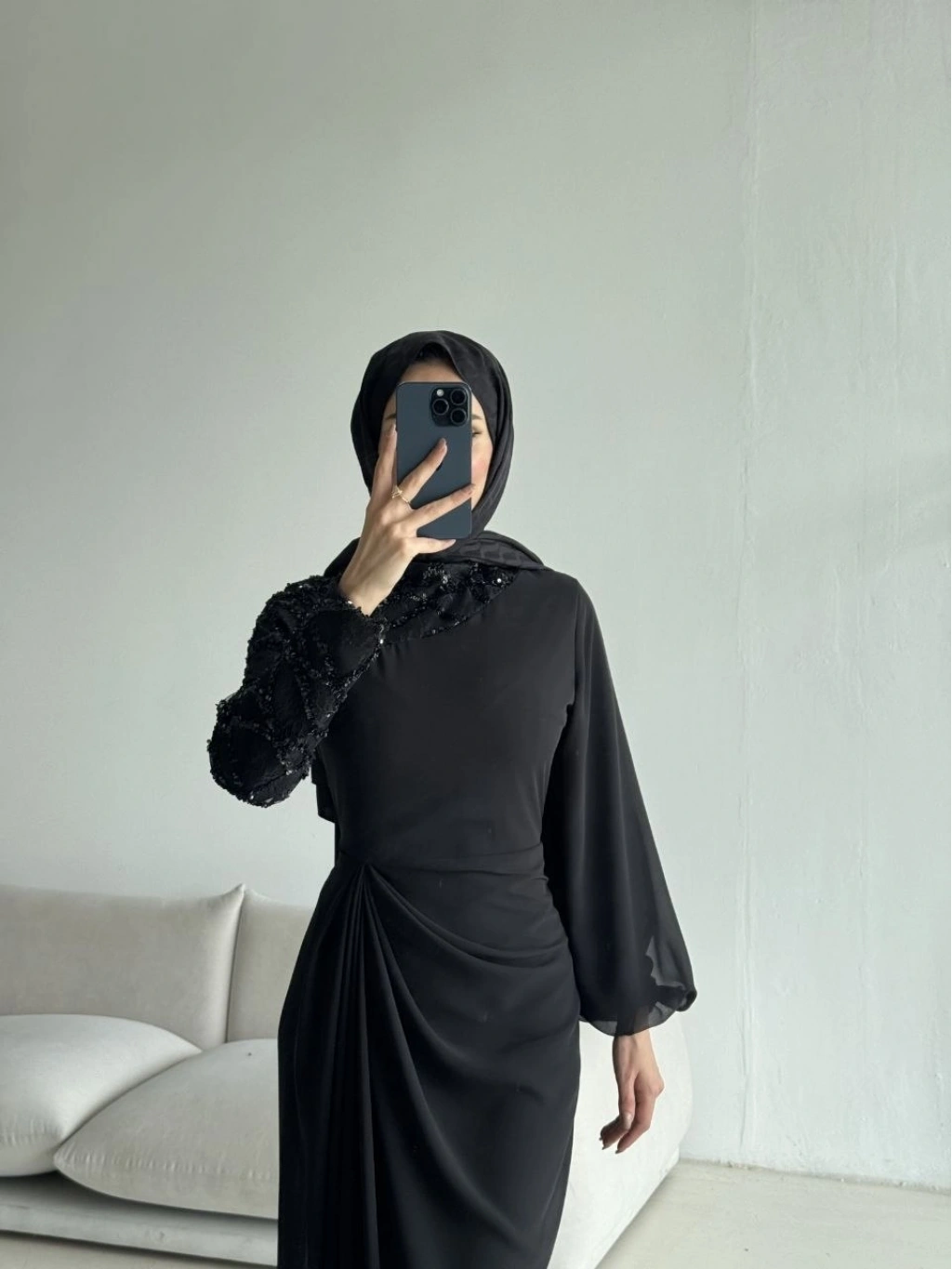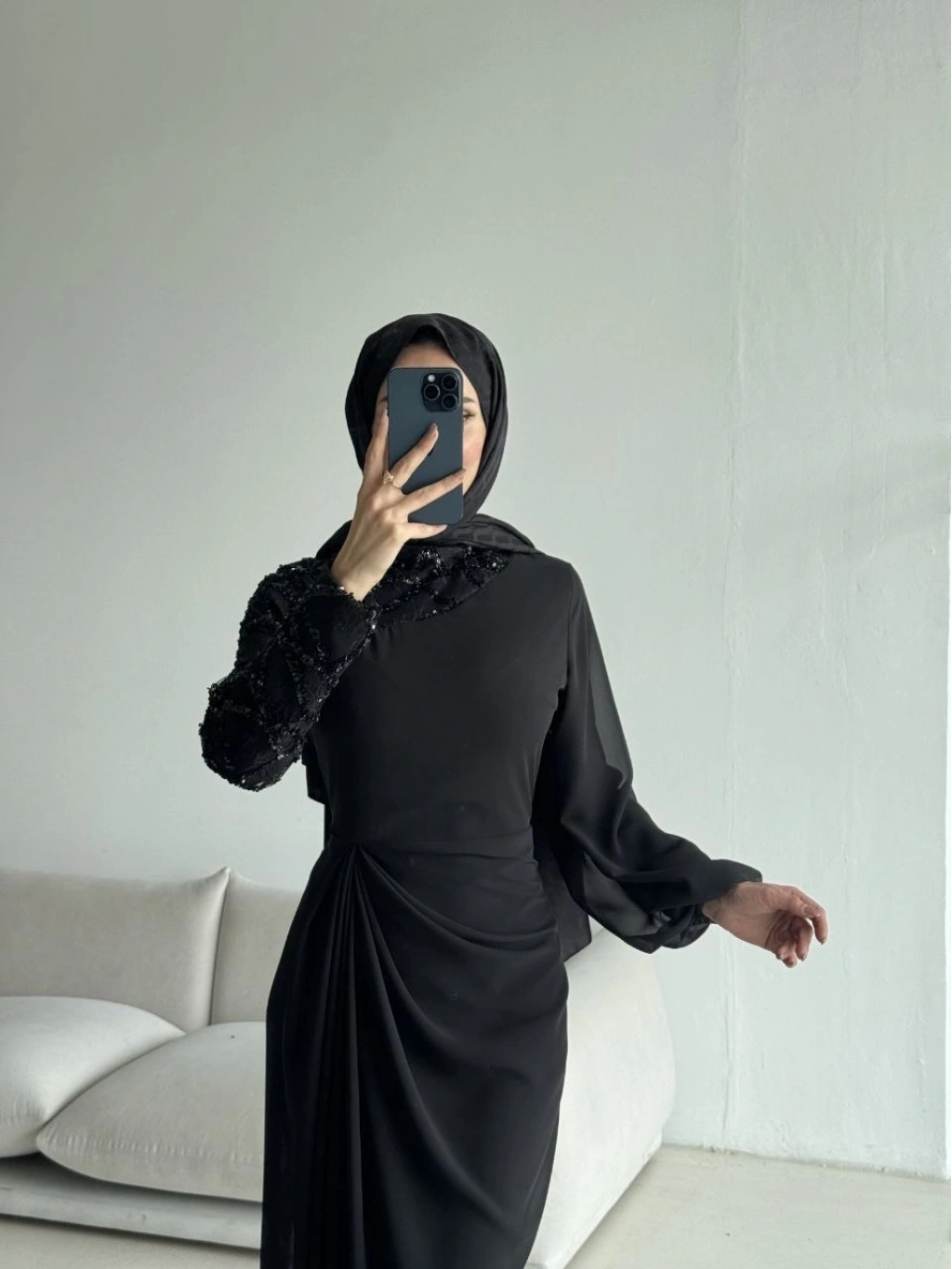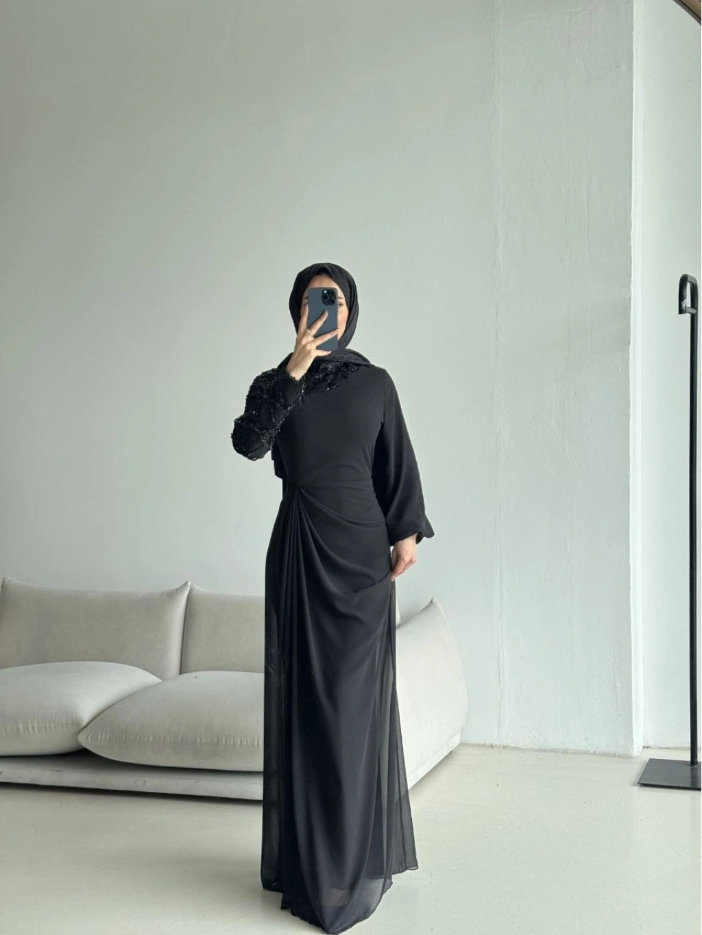 Akıcı ve hafif dokusuyla öne çıkan şifon kumaştan tasarlanan bu zarif elbise, özel günleriniz için sofistike bir seçenek sunar. Vücudu nazikçe saran formu ve bel kısmındaki drape detayı, feminen bir siluet oluşturur. Tek kol tasarımıyla modern bir dokunuş kazanan modelin, diğer kolunda yer alan dantel üzeri payet işlemeler ışıltılı ve dikkat çekici bir görünüm sağlar.