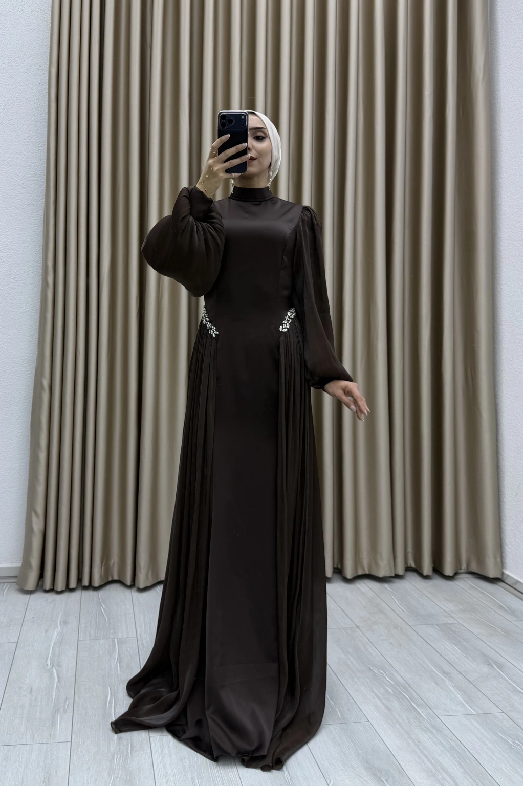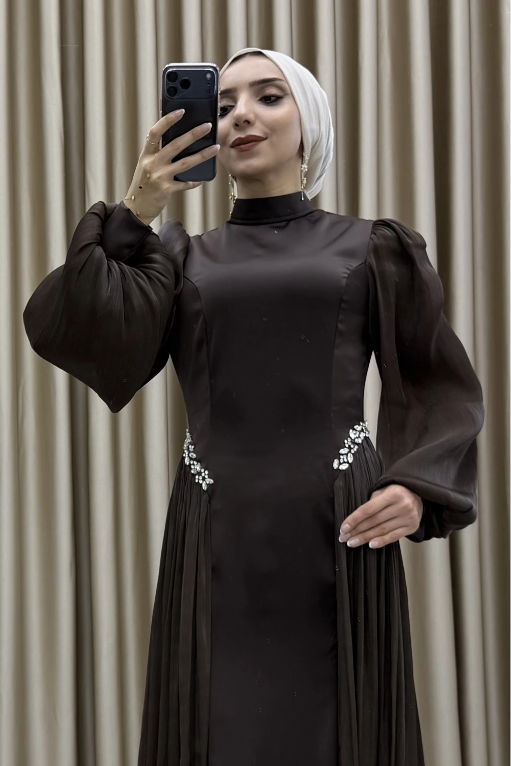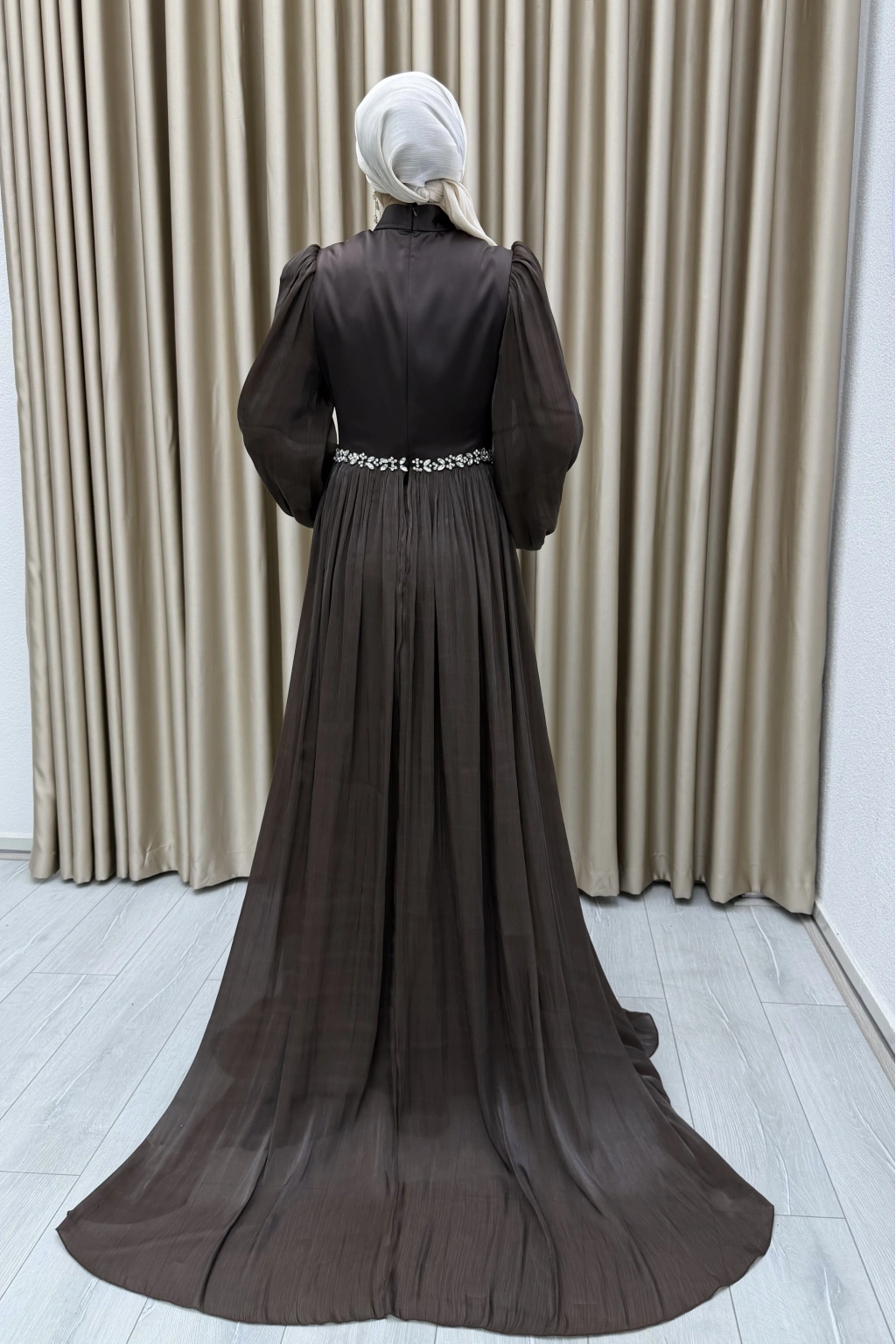 Bel Taş İşlemeli, Şifon Pile Detaylı, Balon Kollu, Dik Yaka, Uzun Boy, A Kesim Zarif Abiye Elbise