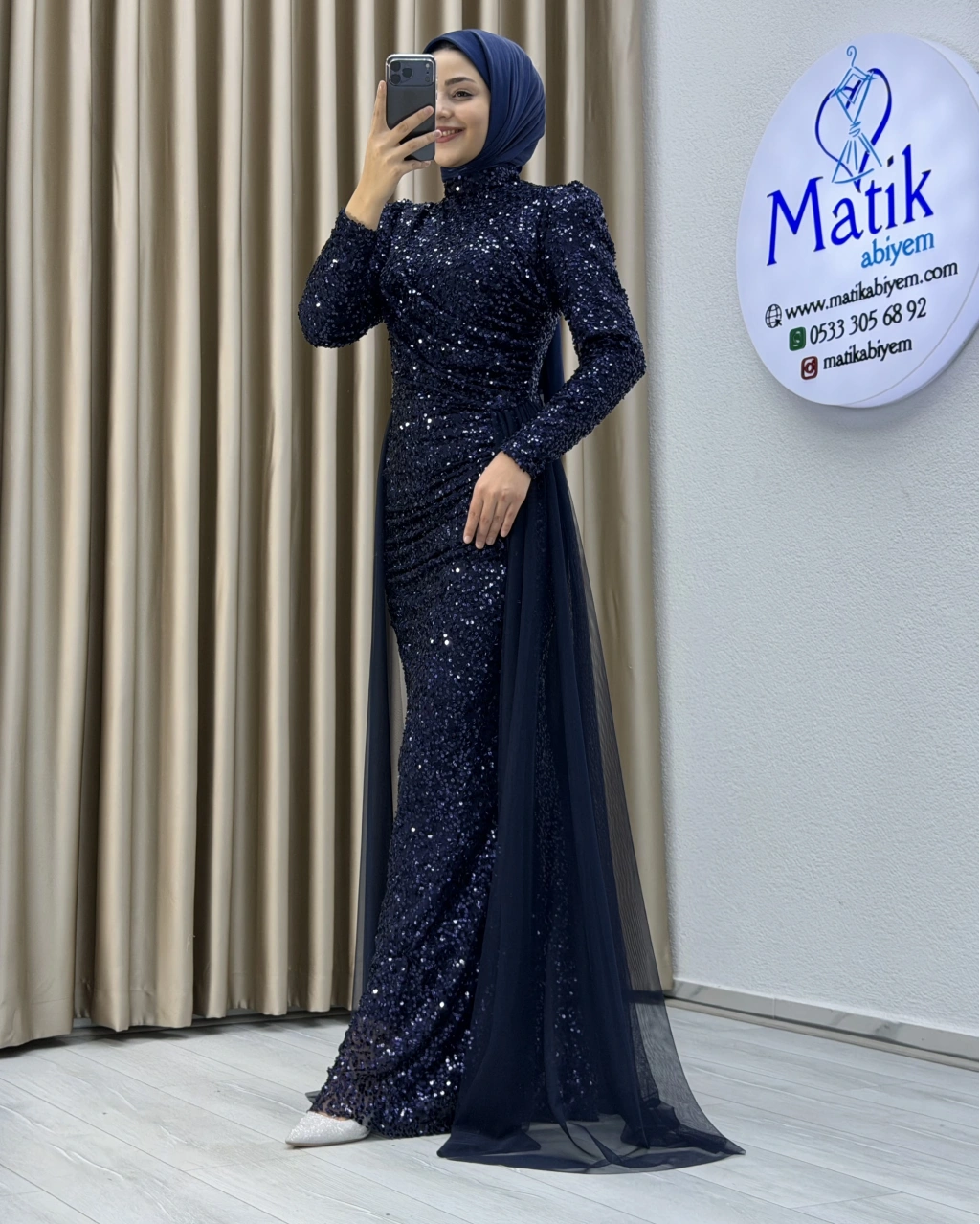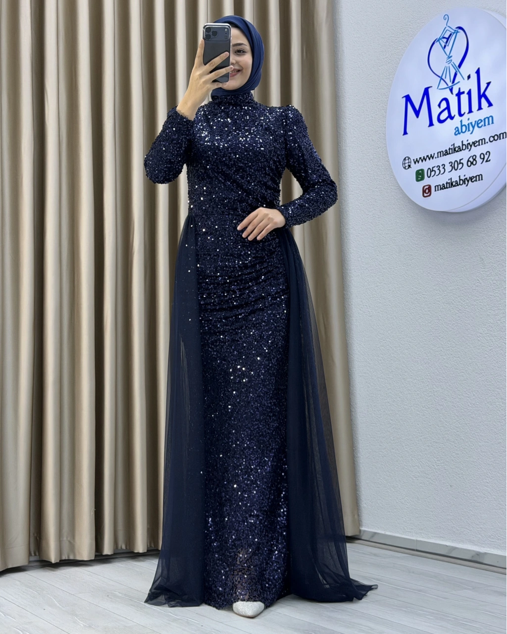 Yoğun Payet İşleme: Üst bedendeki parlak ve kaliteli payetler ışığı mükemmel şekilde yansıtarak elbiseye göz alıcı bir görünüm kazandırır.