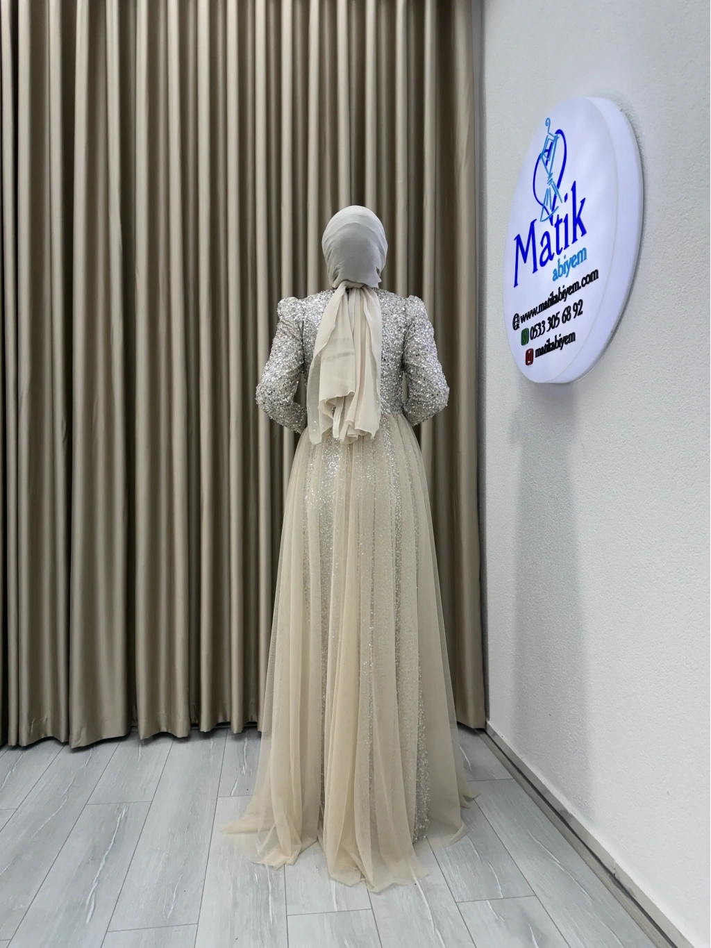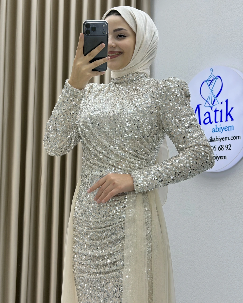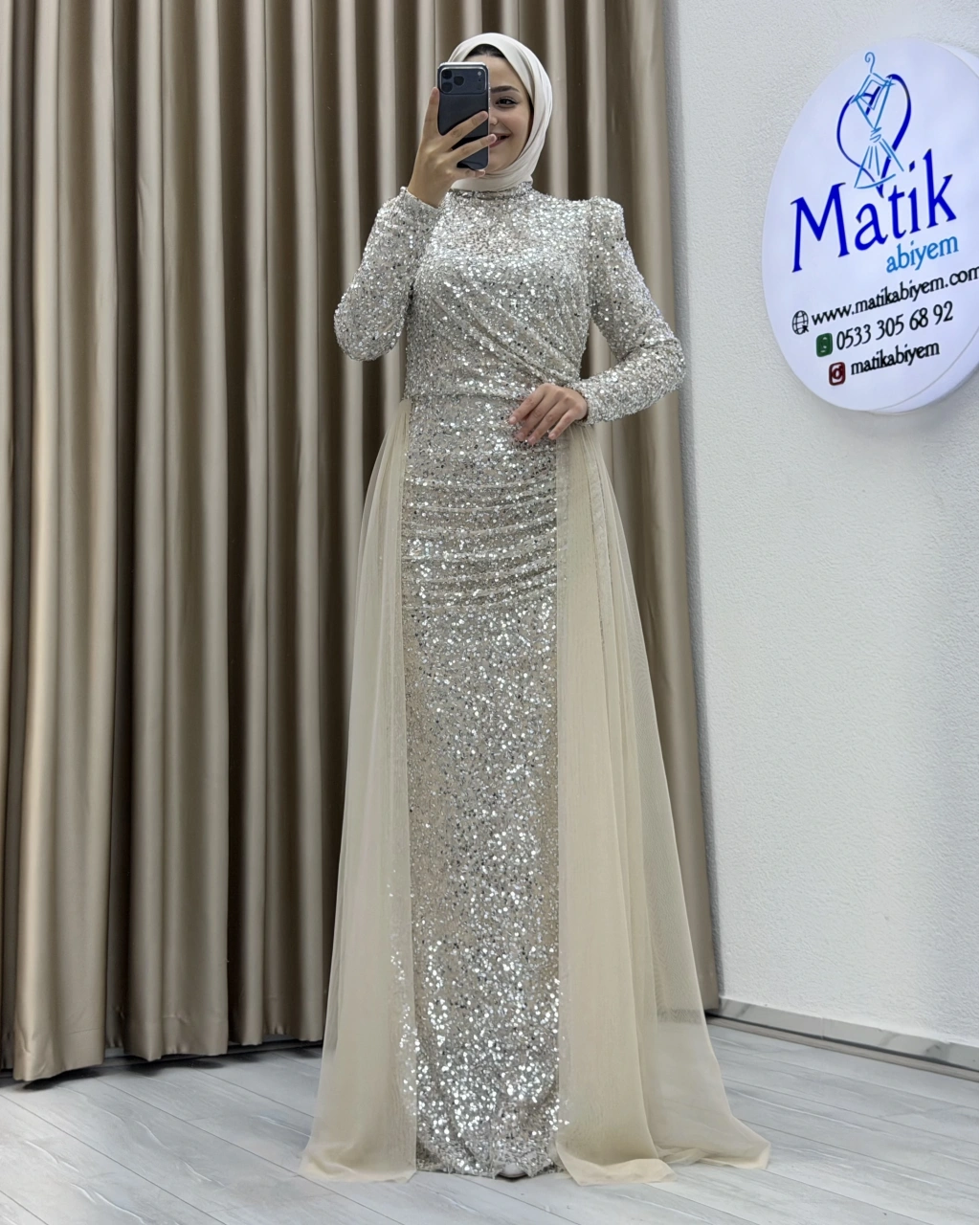 Yoğun Payet İşleme: Üst bedendeki parlak ve kaliteli payetler ışığı mükemmel şekilde yansıtarak elbiseye göz alıcı bir görünüm kazandırır.