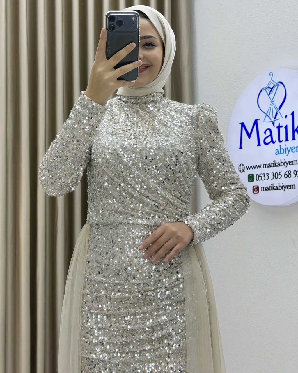 Işıltıyı zarafetle buluşturan Boru Payet ve Tül Abiye, özel günlerinize büyüleyici bir dokunuş katar. Üst bölümdeki yoğun payet işlemeler modern bir şıklık sağlarken, etek kısmındaki yumuşak tül katmanları elbiseye romantik ve akıcı bir görünüm verir. Vücuda oturan formuyla silueti kusursuz bir şekilde ortaya çıkaran bu tasarım; nişan, söz, mezuniyet ve tüm özel davetlerde göz kamaştırmak isteyenler için ideal bir seçimdir.