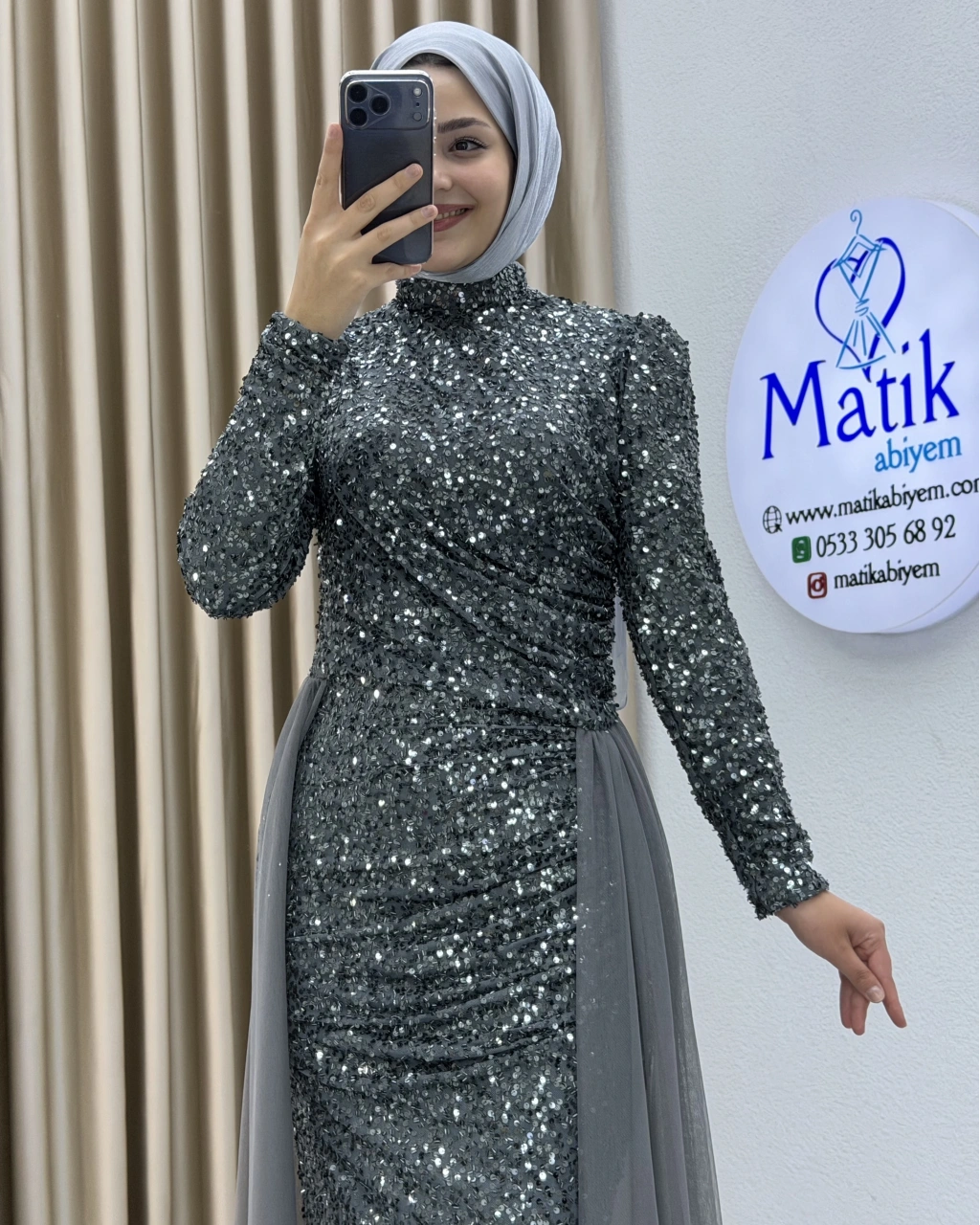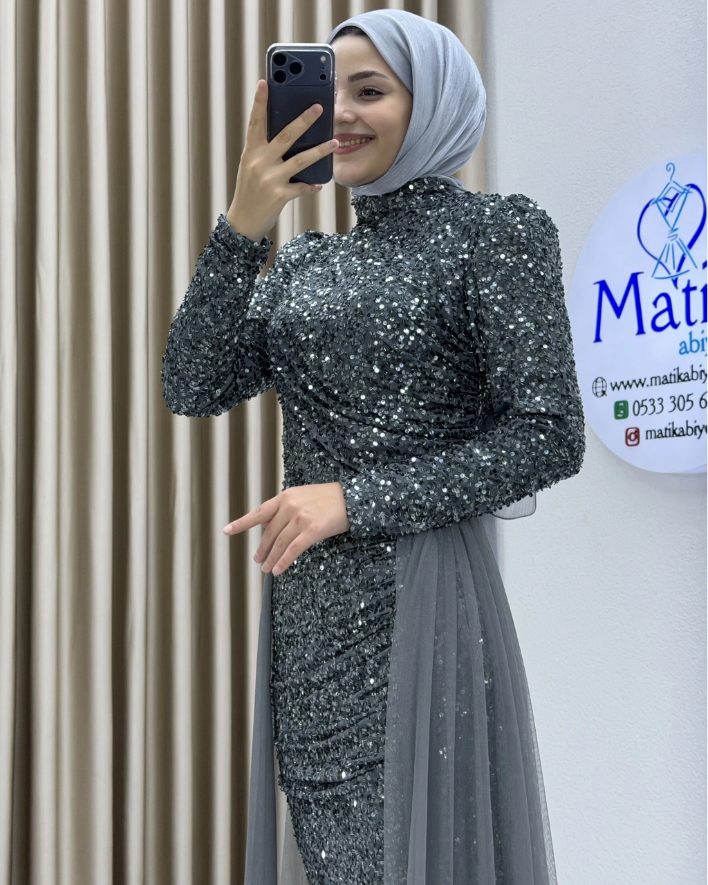 Işıltıyı zarafetle buluşturan Boru Payet ve Tül Abiye, özel günlerinize büyüleyici bir dokunuş katar. Üst bölümdeki yoğun payet işlemeler modern bir şıklık sağlarken, etek kısmındaki yumuşak tül katmanları elbiseye romantik ve akıcı bir görünüm verir. Vücuda oturan formuyla silueti kusursuz bir şekilde ortaya çıkaran bu tasarım; nişan, söz, mezuniyet ve tüm özel davetlerde göz kamaştırmak isteyenler için ideal bir seçimdir.