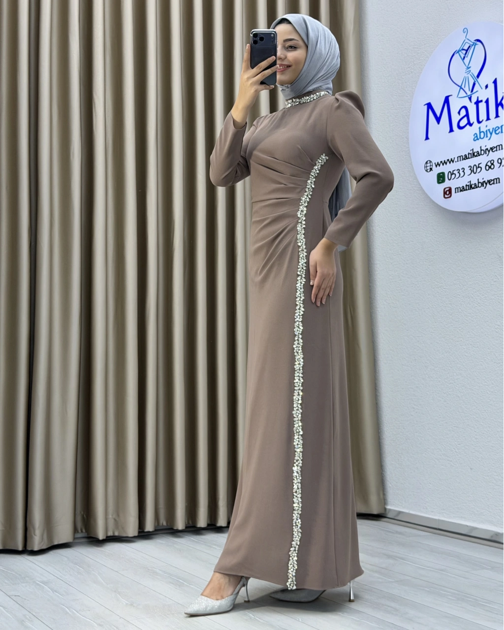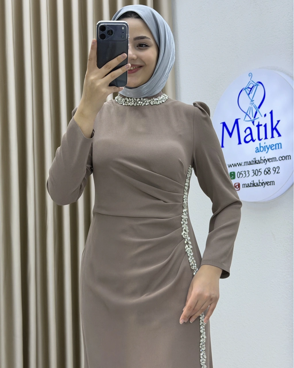 Zarafetin ve konforun bir araya geldiği Çift Taraflı Krep Tesettür Abiye, özel davetler, düğünler ve nişan gibi önemli günler için tasarlanmıştır. Özel çift taraflı krep kumaşı, hem şık bir görünüm hem de yumuşak bir dokunuş sunar.