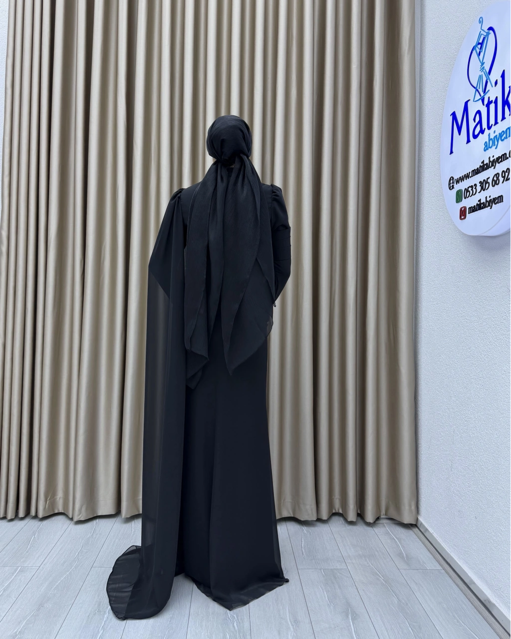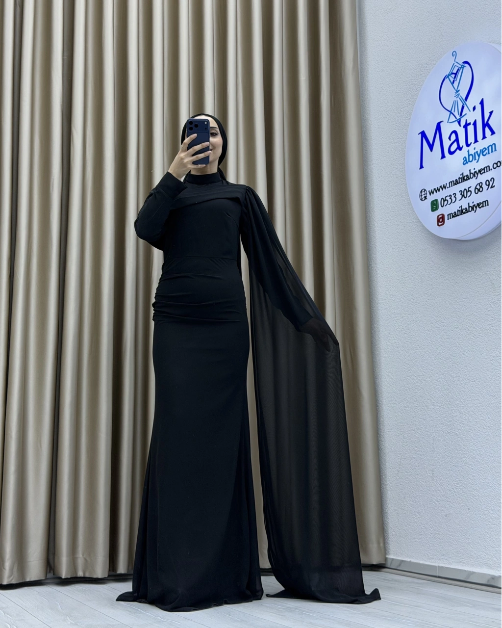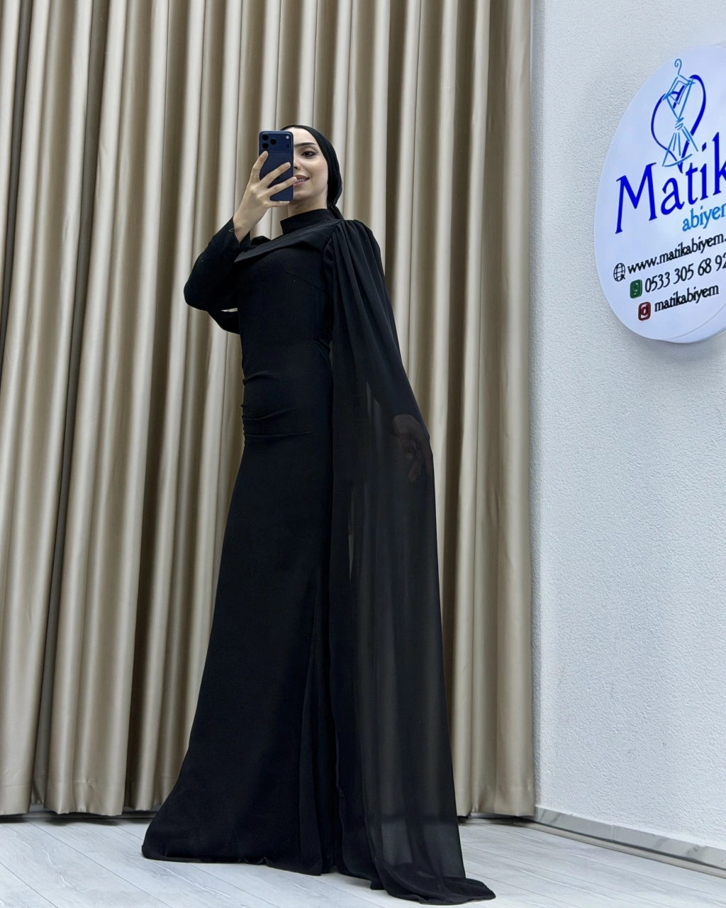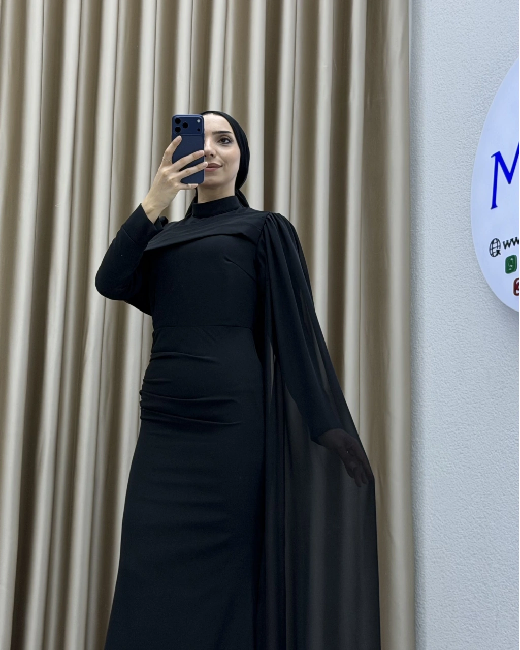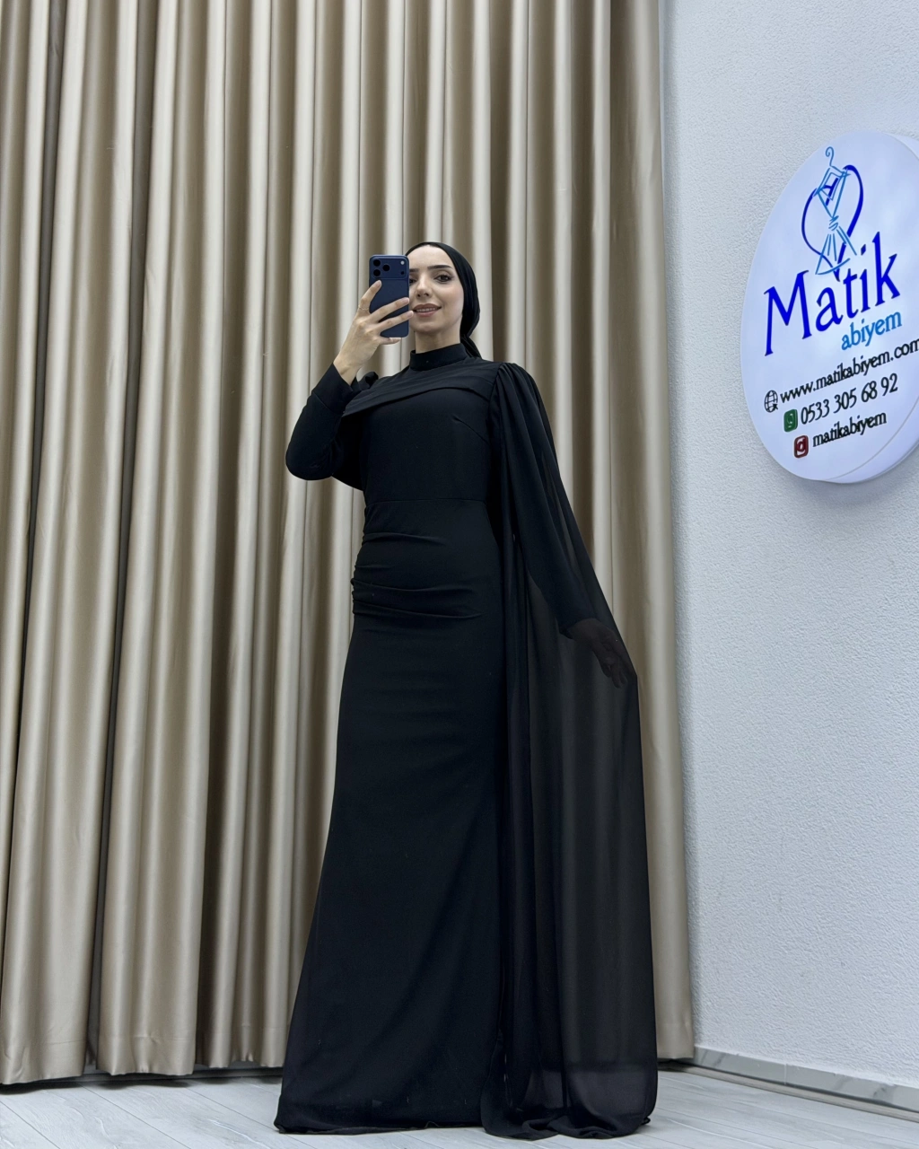 Uzun kollu yapısı ve dökümlü formu, hem şık hem de ölçülü bir stil arayanlar için ideal bir tercih oluşturur. Elbisenin arka ve yan kısımlarında yer alan hafif transparan dökümlü parça, tasarıma zarif bir akış kazandırarak klasik görünümü modern bir dokunuşla tamamlar. Özel gün kombinlerinde topuklu ayakkabılar ve minimal aksesuarlarla rahatlıkla kullanılabilir.