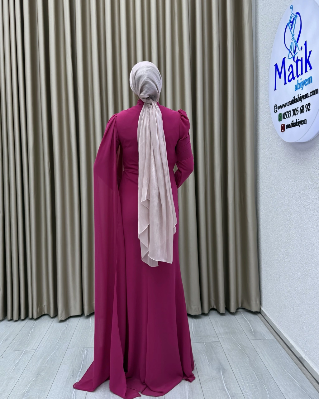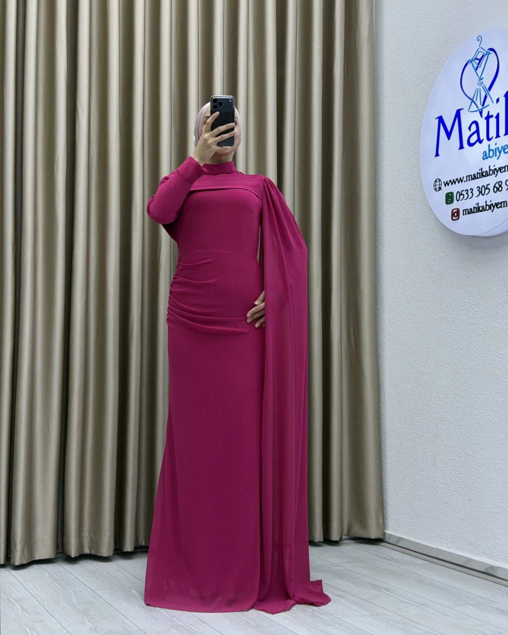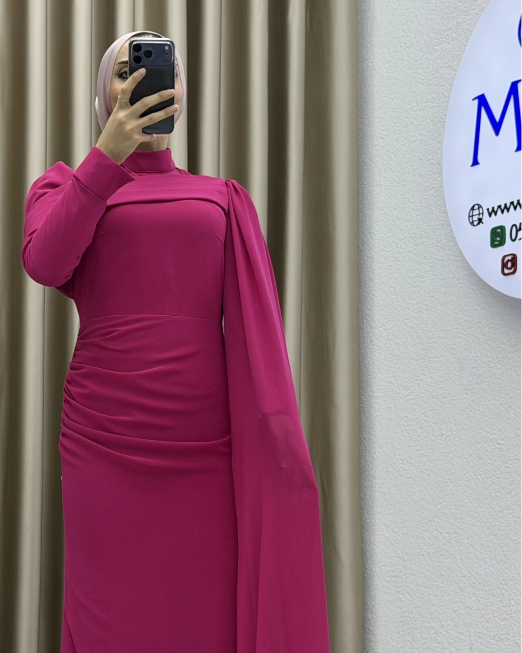 Uzun kollu yapısı ve dökümlü formu, hem şık hem de ölçülü bir stil arayanlar için ideal bir tercih oluşturur. Elbisenin arka ve yan kısımlarında yer alan hafif transparan dökümlü parça, tasarıma zarif bir akış kazandırarak klasik görünümü modern bir dokunuşla tamamlar. Özel gün kombinlerinde topuklu ayakkabılar ve minimal aksesuarlarla rahatlıkla kullanılabilir.