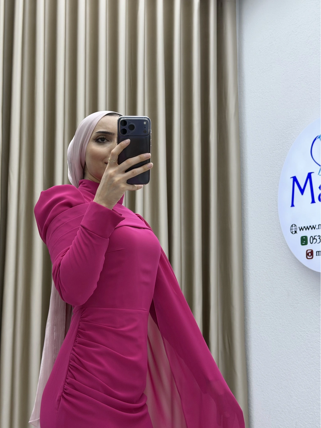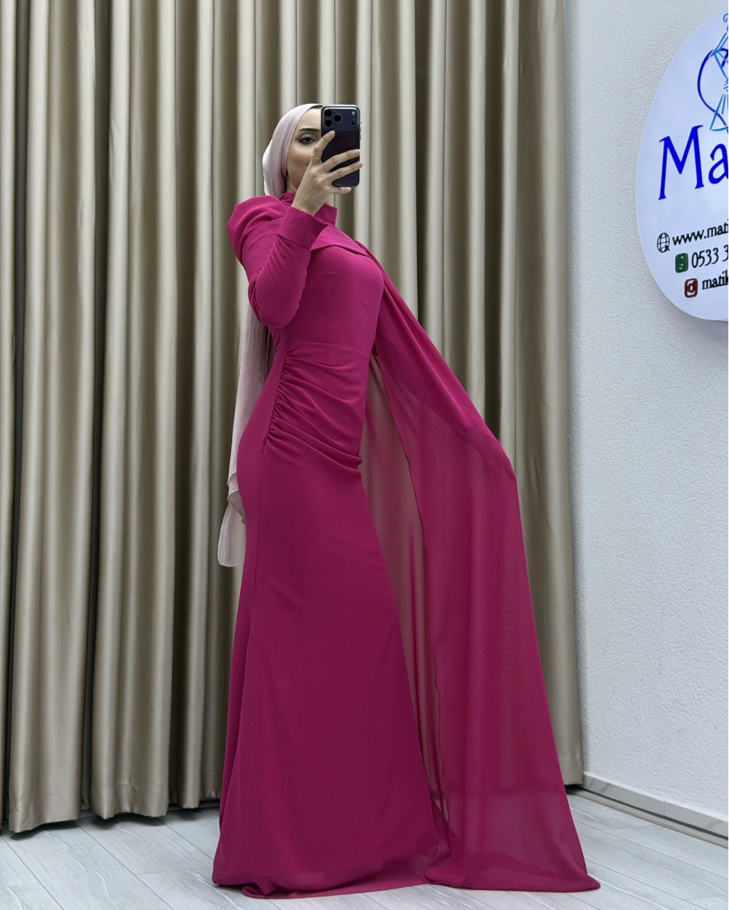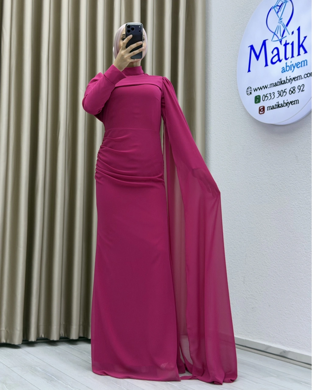 Uzun kollu yapısı ve dökümlü formu, hem şık hem de ölçülü bir stil arayanlar için ideal bir tercih oluşturur. Elbisenin arka ve yan kısımlarında yer alan hafif transparan dökümlü parça, tasarıma zarif bir akış kazandırarak klasik görünümü modern bir dokunuşla tamamlar. Özel gün kombinlerinde topuklu ayakkabılar ve minimal aksesuarlarla rahatlıkla kullanılabilir.