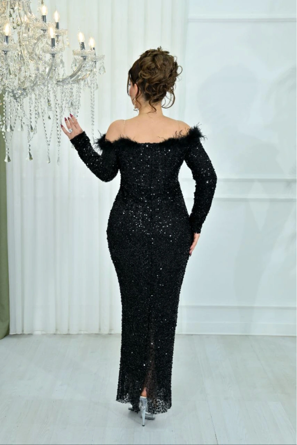 Kuş Tüyü Omuz Detaylı Payet Abiye
