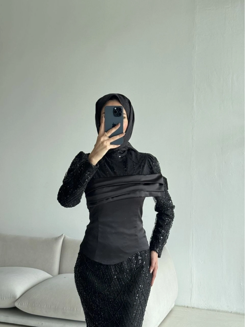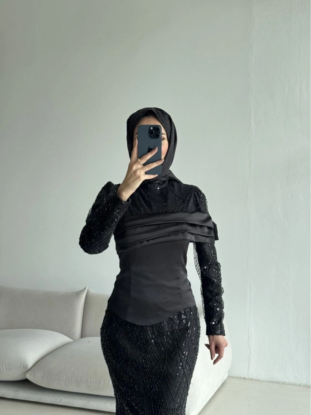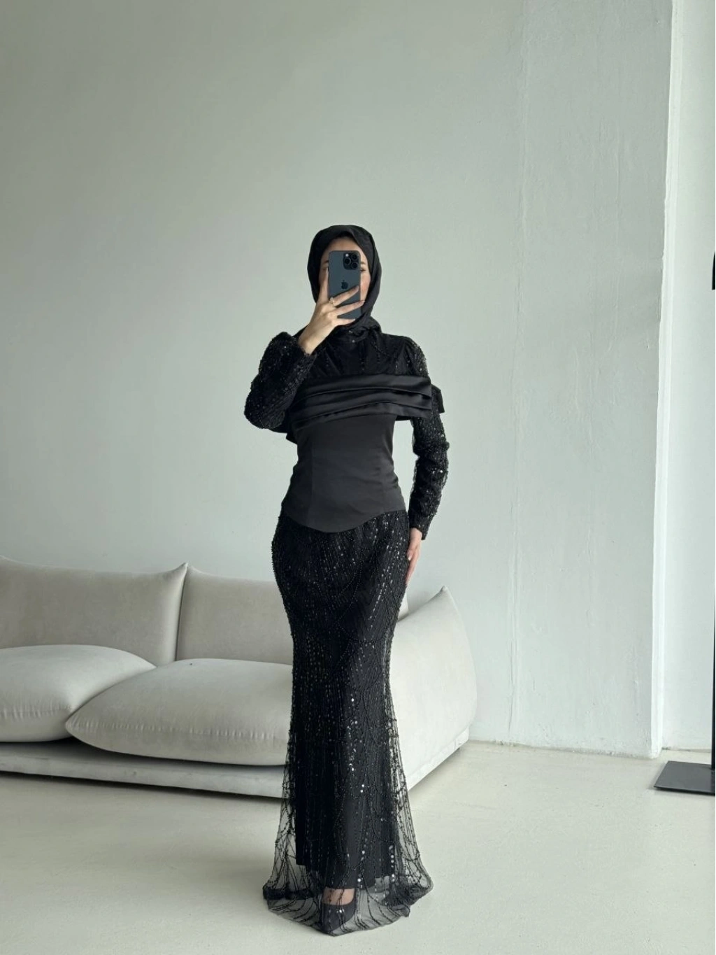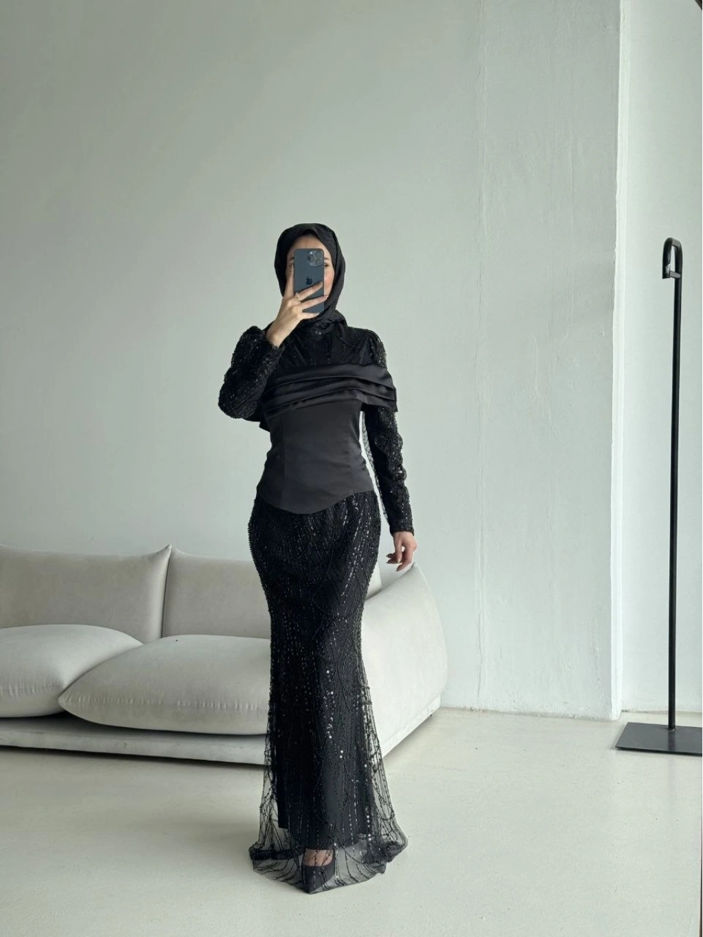 Zarif ve göz alıcı bir duruş sunan bu özel tasarım abiye, modern şıklık ile klasik detayları kusursuz şekilde bir araya getirir. İnce işlenmiş ışıltılı detaylarla zenginleştirilerek gece davetlerinde tüm dikkatleri üzerinize çeker.