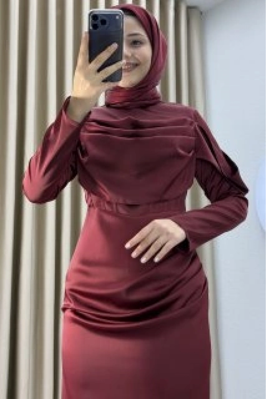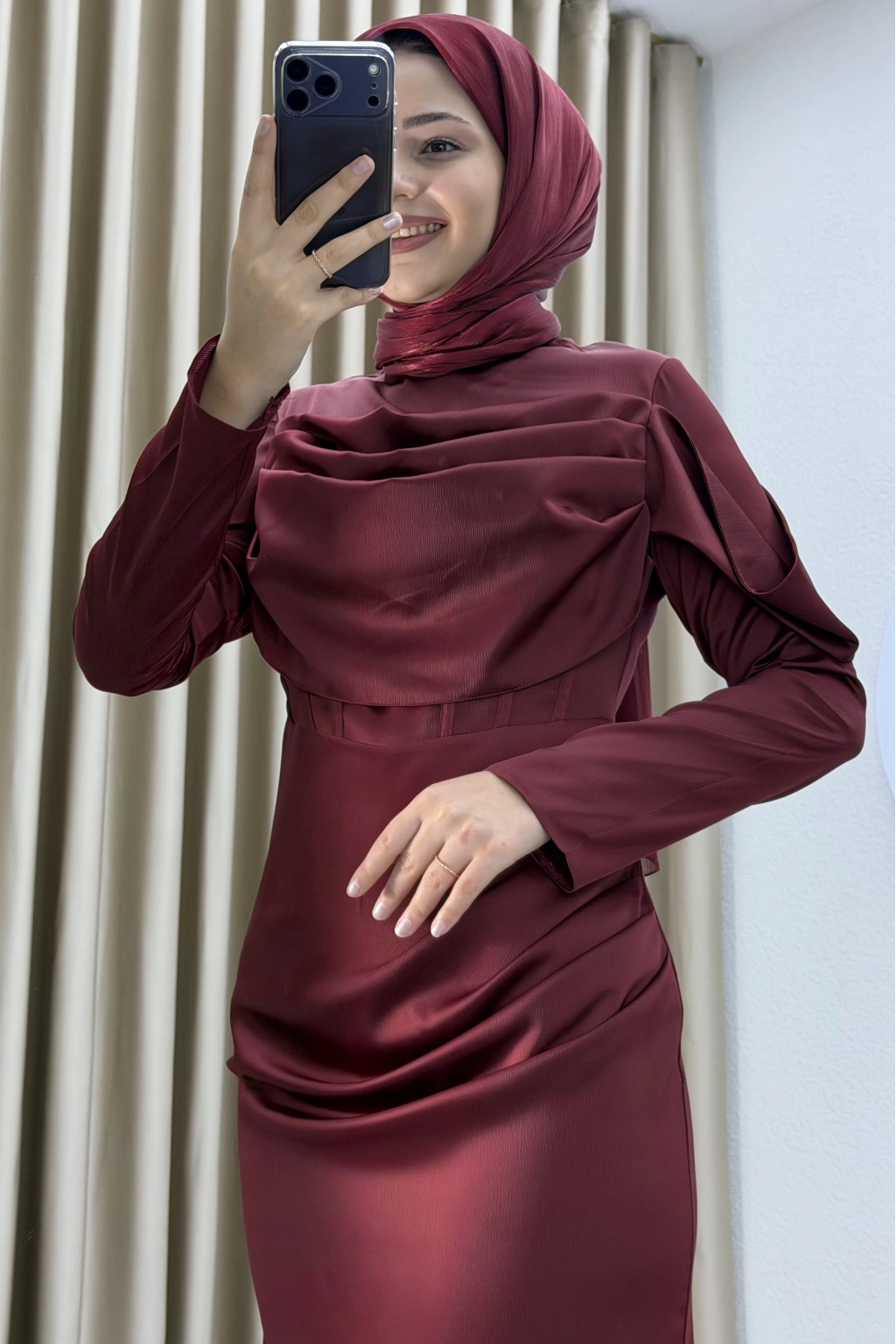 • Zarif drape detayı ve sade şıklığıyla öne çıkan, uzun boy ve slim fit kesime sahip modern abiye elbise.