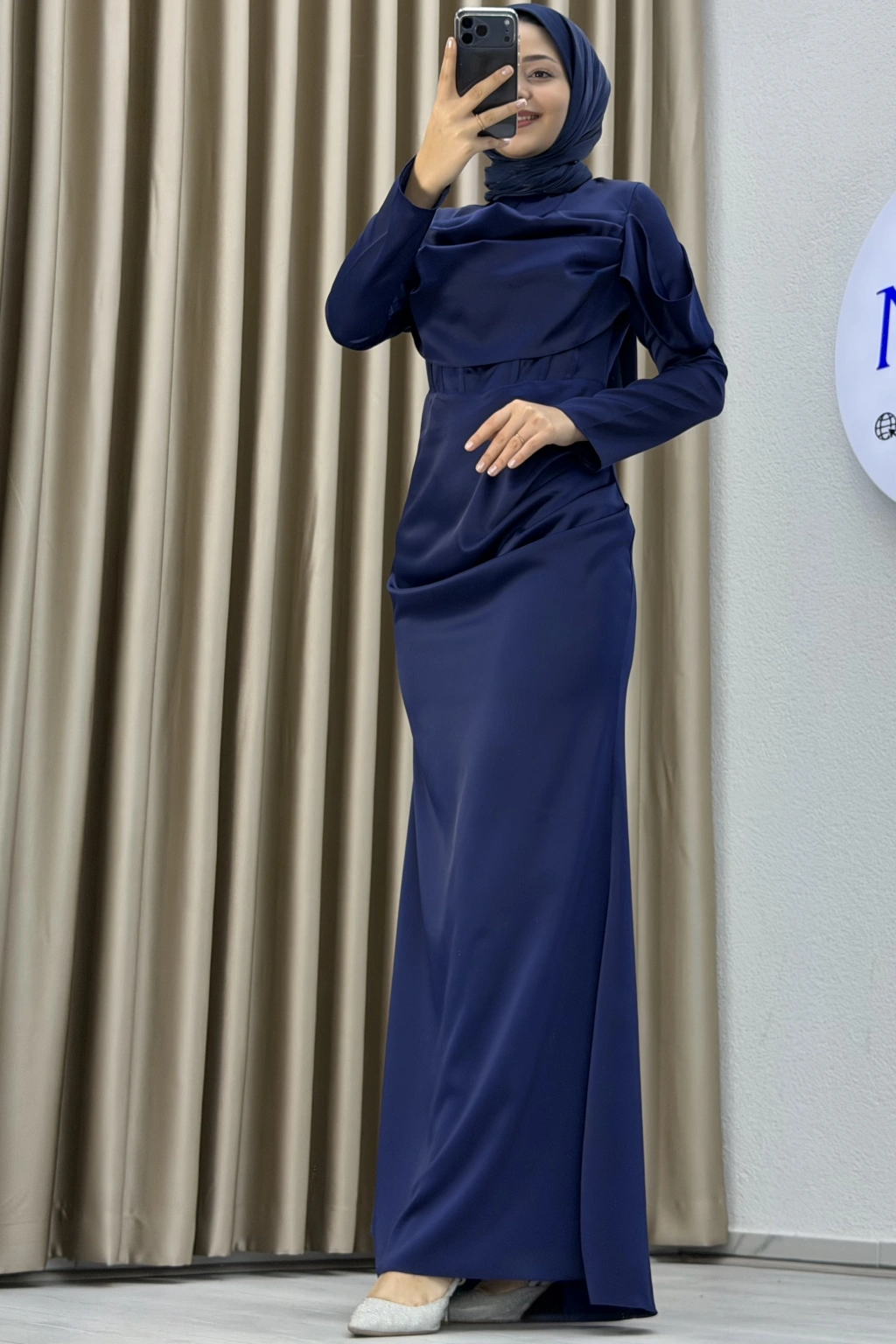 • Zarif drape detayı ve sade şıklığıyla öne çıkan, uzun boy ve slim fit kesime sahip modern abiye elbise.