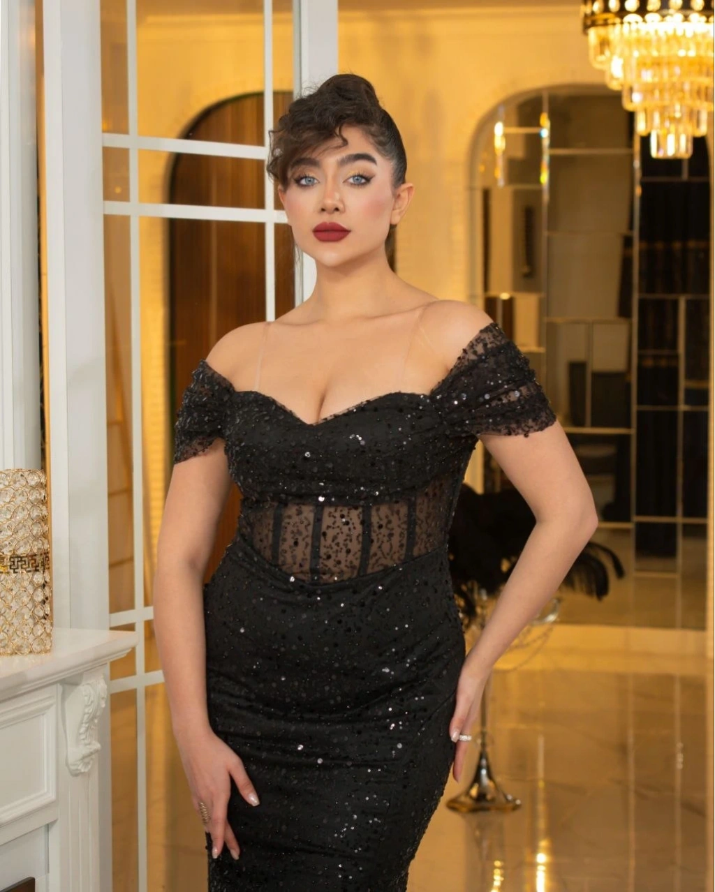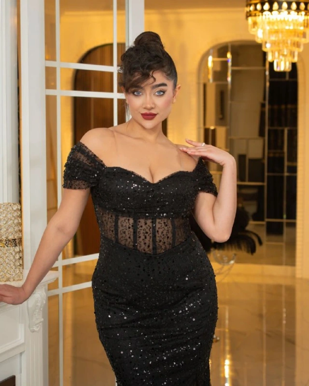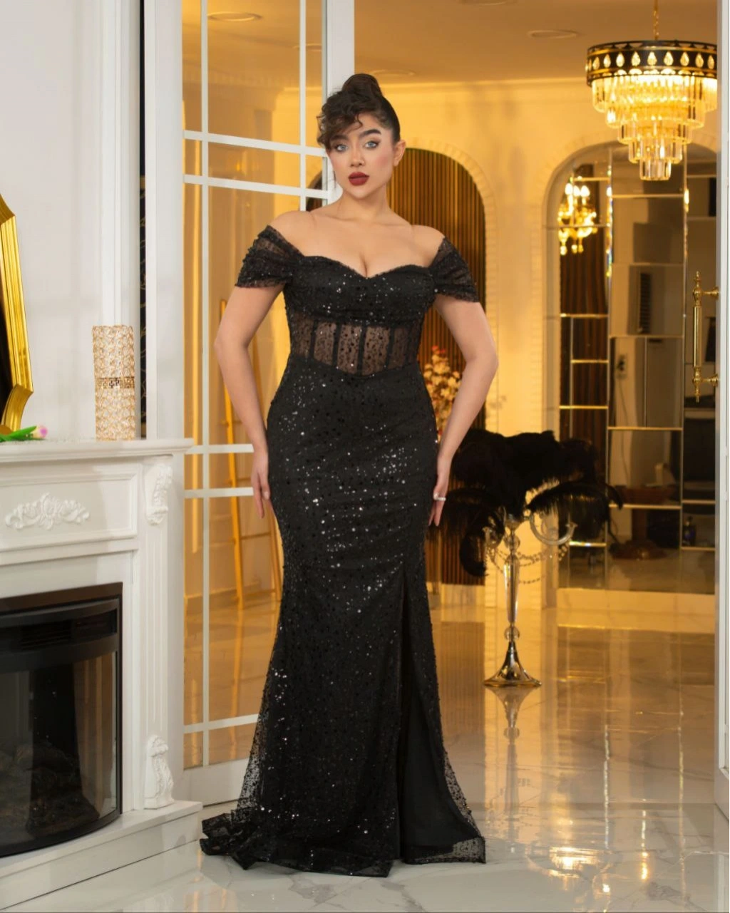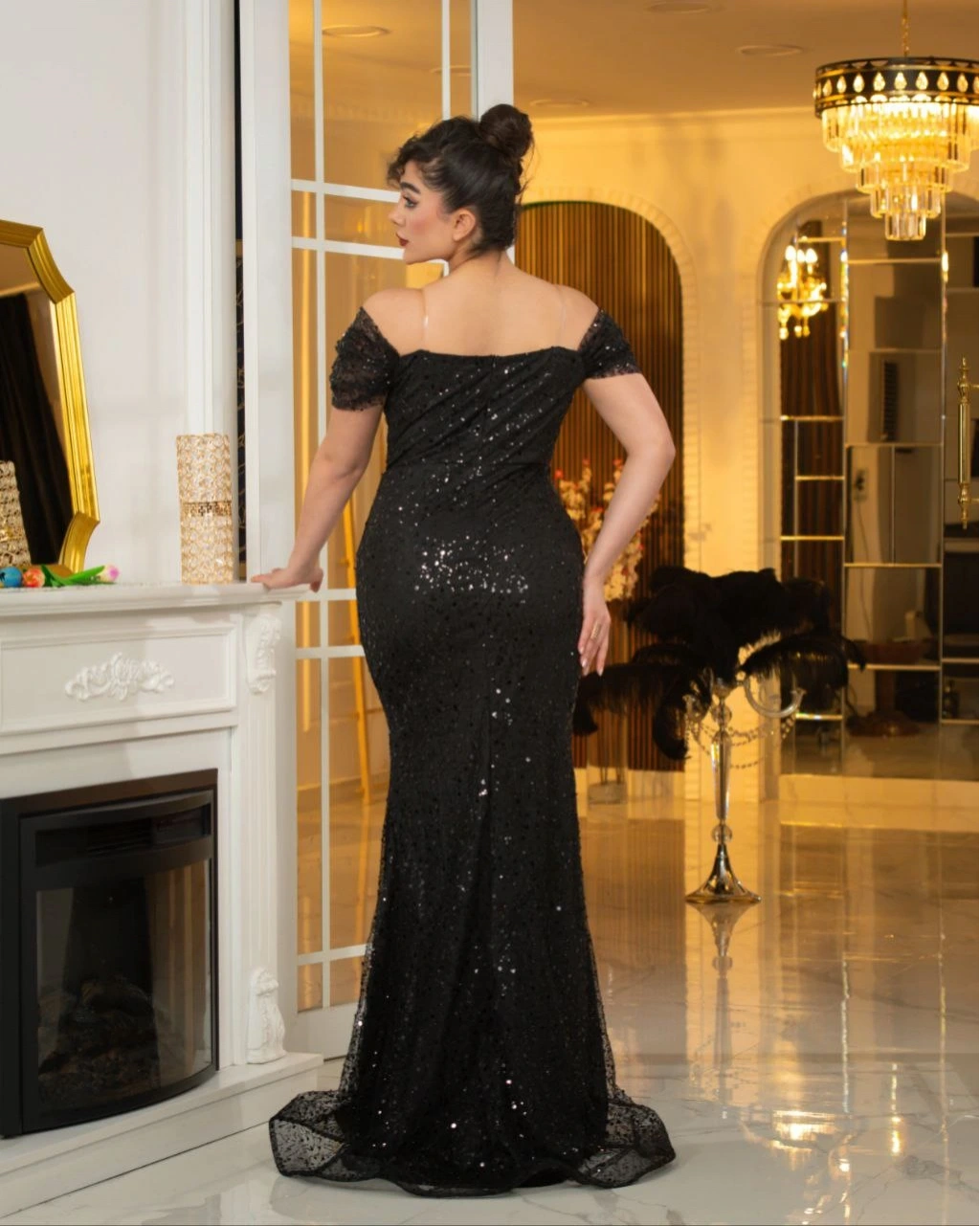 • Zarif omuz kesimi, dantel ve ışıltılı dokusuyla özel davetlerde feminen ve güçlü bir siluet sunan uzun abiye elbise.