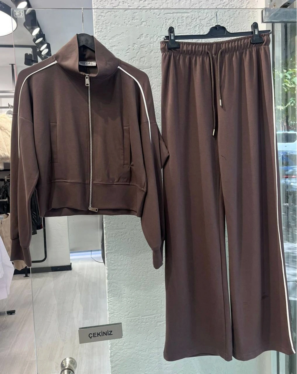 • Biye detayları takımın yanlarında, fermuar çevresinde şık kontrast bir çizgi efekti yaratıyor.
