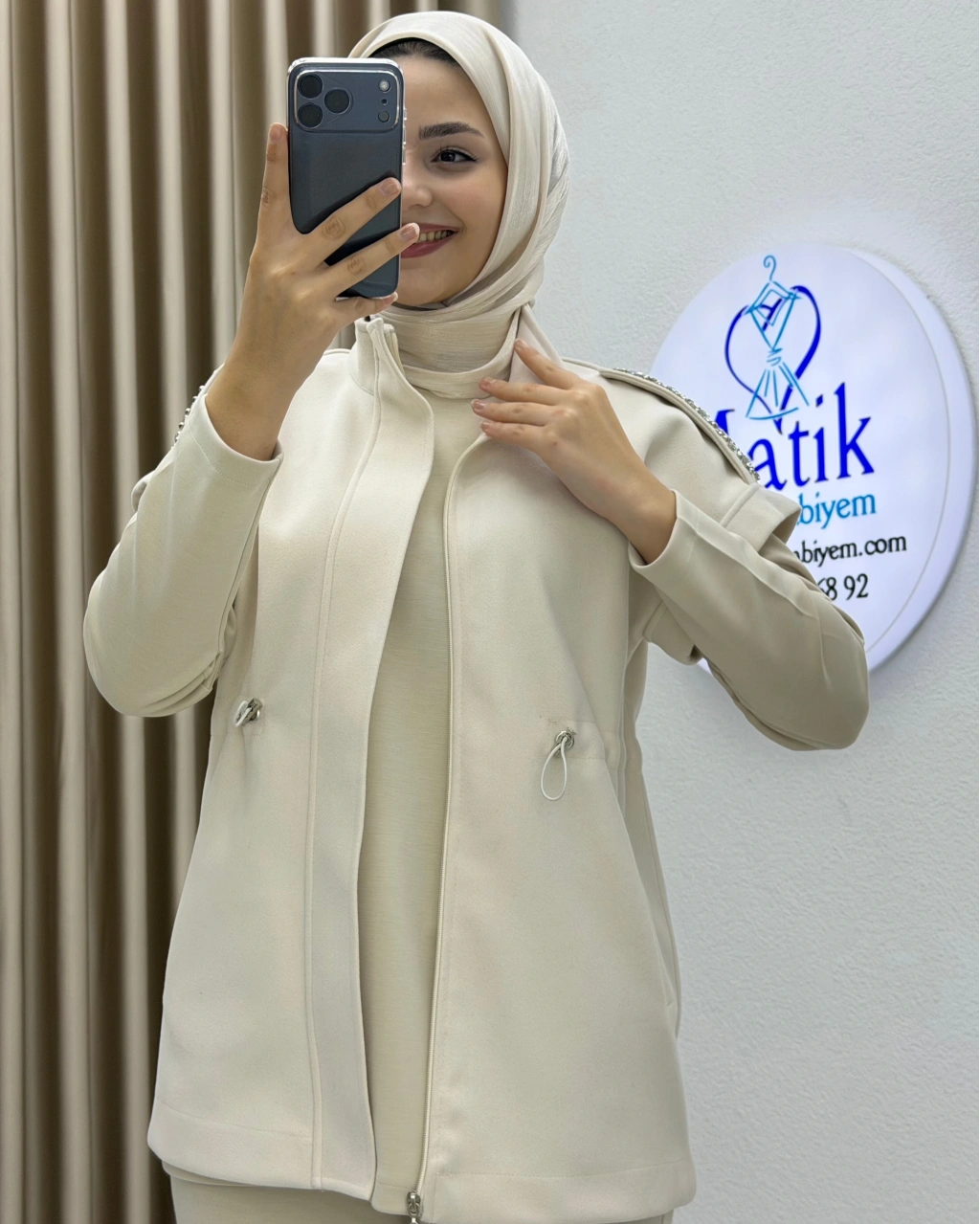 • Takımın ön kısmında yer alan kaşe yelek, keskin ve modern hatlarıyla tasarımı öne çıkarır. Yeleğin ön paneli, minimal çizgileri ve akıcı formuyla şık bir siluet oluştururken, alt ve üst parçayla kusursuz bir uyum yakalar. Ön kapama detayları (fermuar, açık yelek formu) rahat bir kullanım sunar. Yeleğin ön yüzü, takıma hem sıcak tutan hem de stil artıran güçlü bir karakter kazandırır.