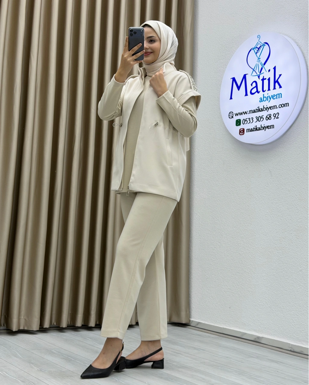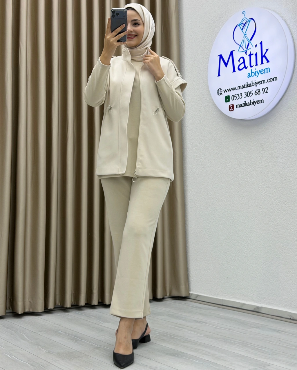 • Takım İçeriği: Kaşe yelek + triko/örme üst + rahat kalıp alt