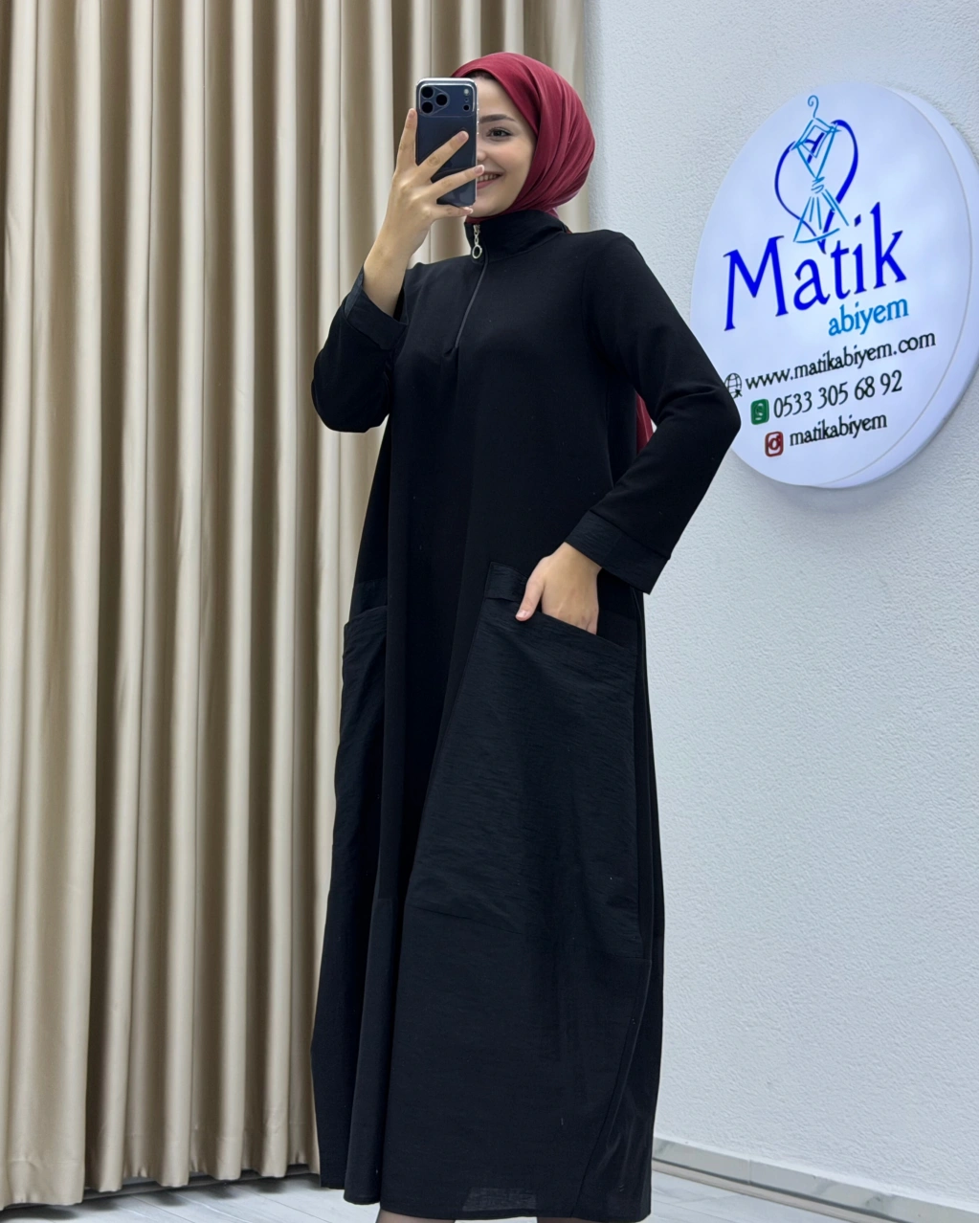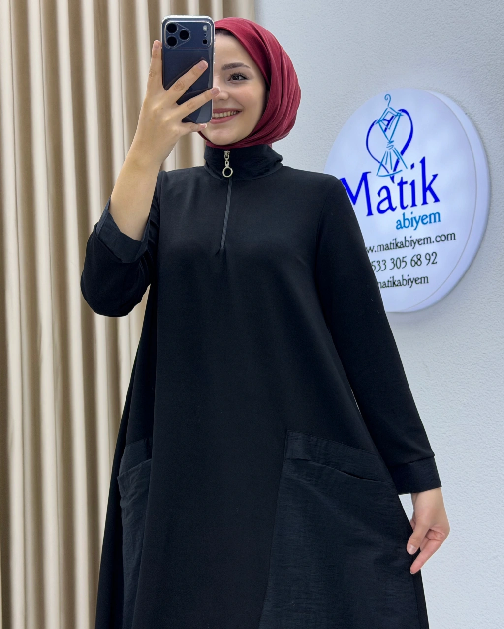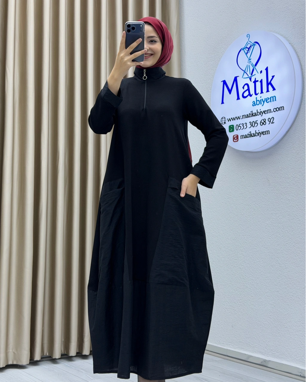 • Elbisenin ön kısmı, sade ama işlevsel bir tasarım anlayışıyla öne çıkar. Hafif paraşüt kumaşın doğal dökümlü yapısı modern bir siluet sunarken, önde konumlandırılmış fonksiyonel cepler sportif bir dokunuş ve pratik kullanım sağlar. Minimal dikiş hatları ve temiz bitişler, elbiseye zarif bir görünüm kazandırır.