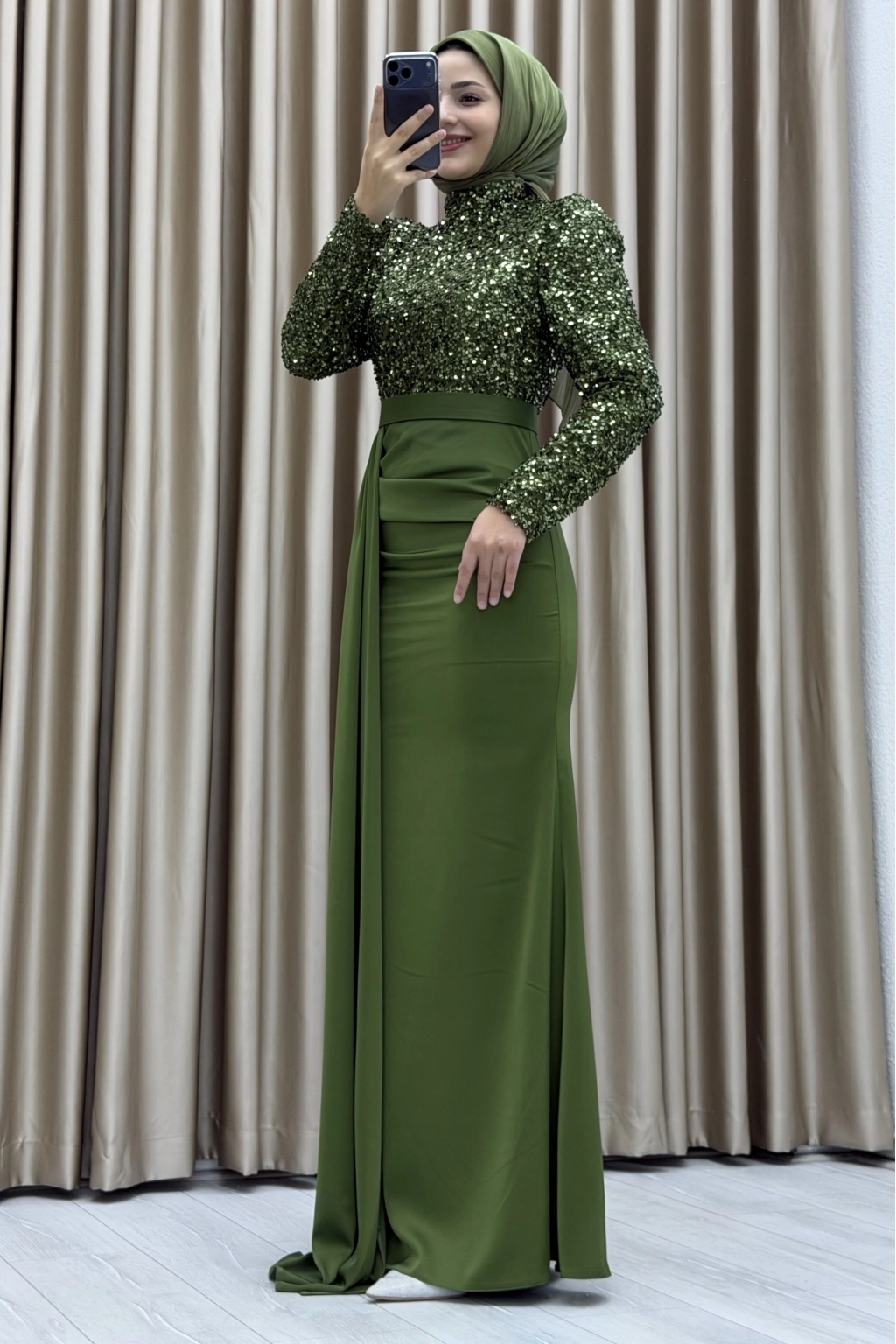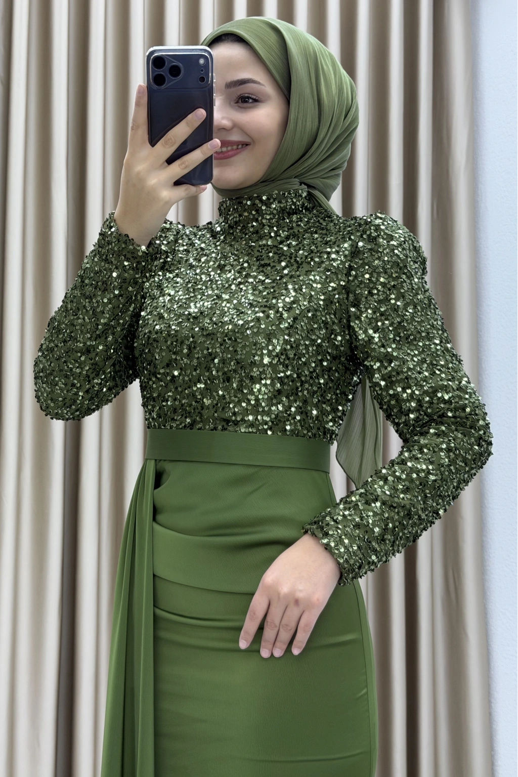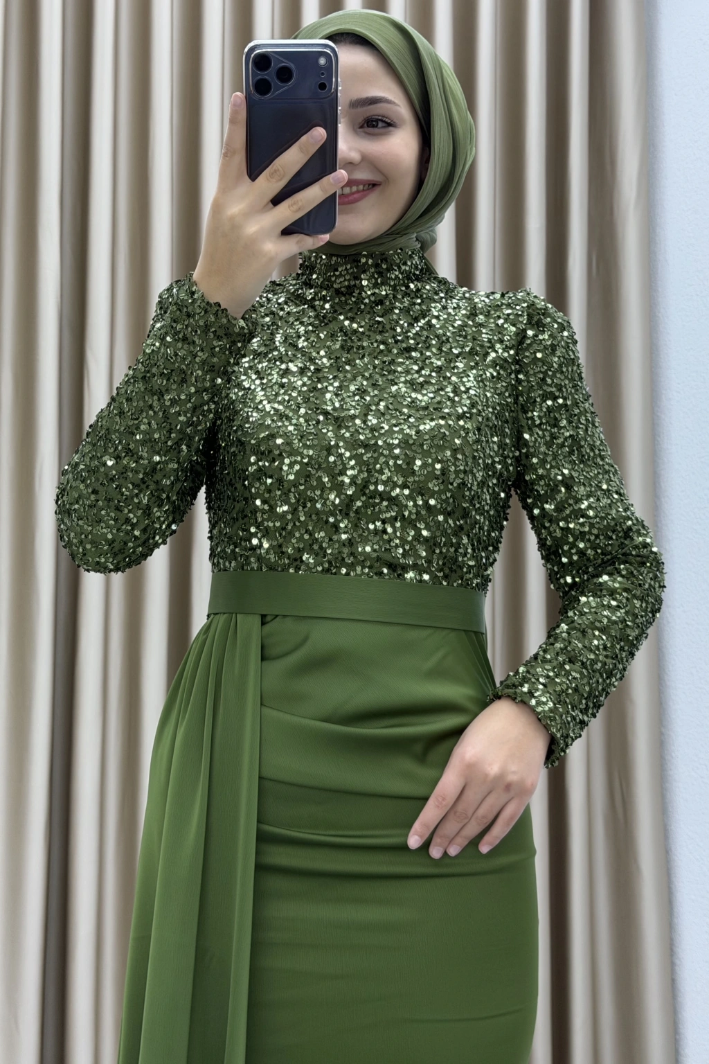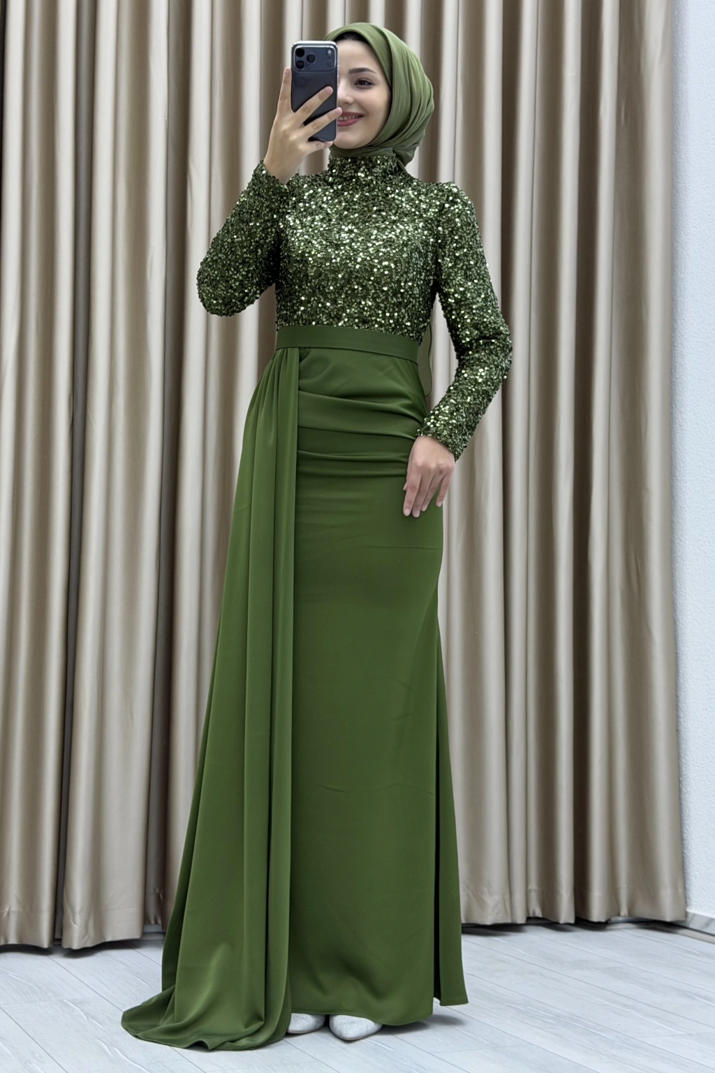 Zarif detayları ve modern siluetiyle öne çıkan bu uzun abiye elbise, özel gün ve davetlerde şıklığını ön plana çıkarmak isteyenler için tasarlanmıştır. Üst bölümde yer alan payet işlemeleri elbiseye ışıltılı ve sofistike bir görünüm kazandırırken, dik yaka ve uzun kol kesimi asil ve dengeli bir duruş sunar.