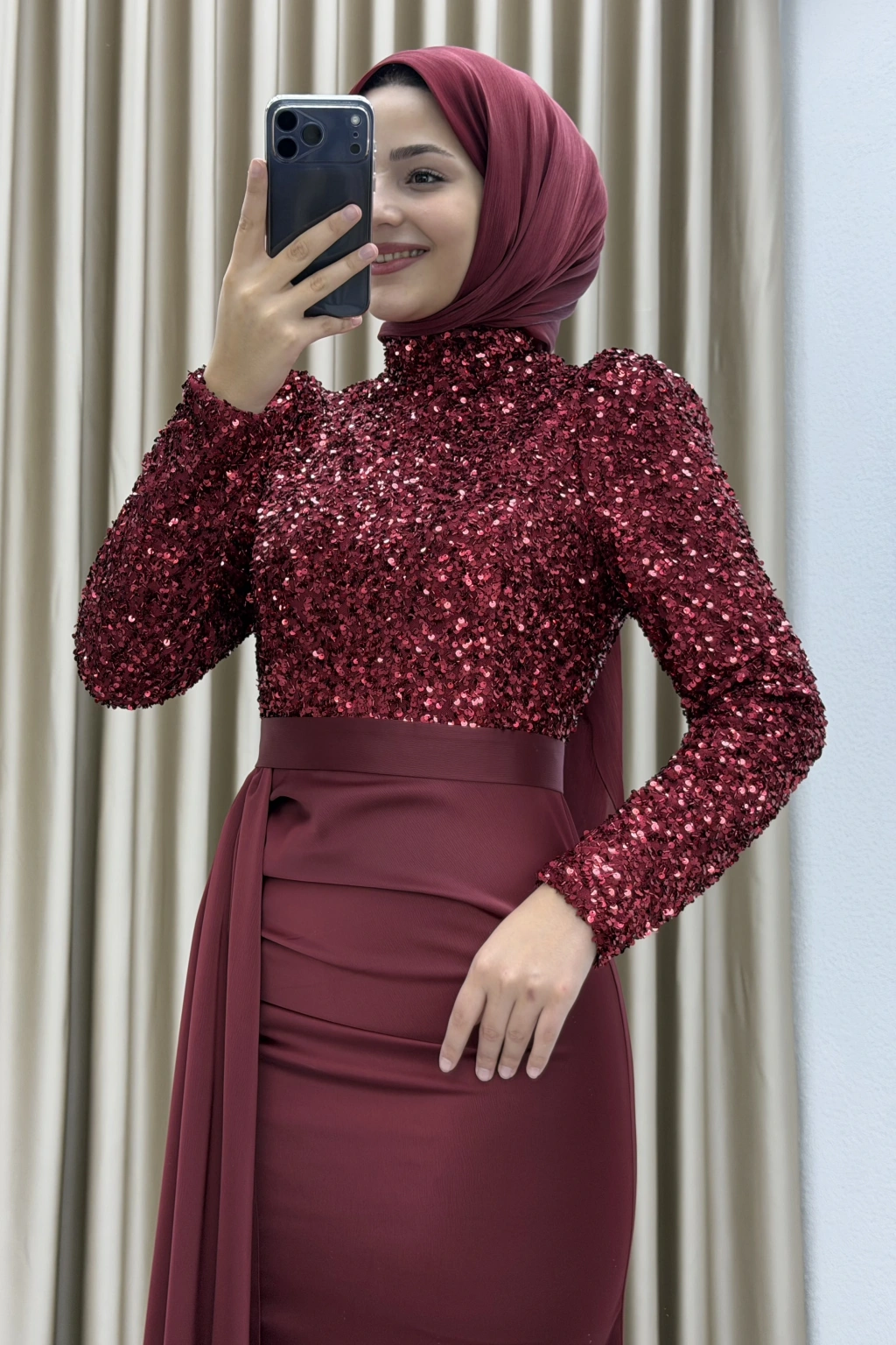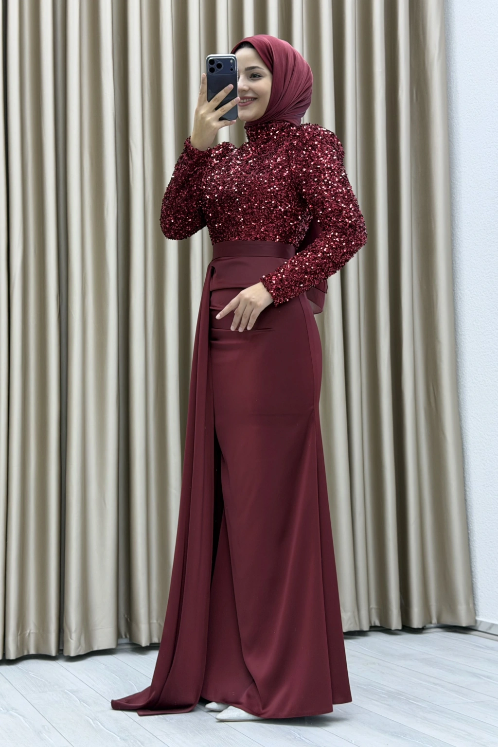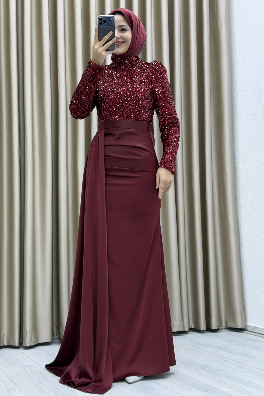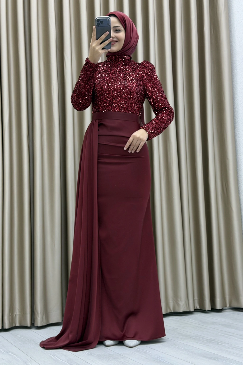 Payet İşlemeli Uzun Kollu Drapeli Etek Detaylı Maxi Boy Şık Abiye Elbise