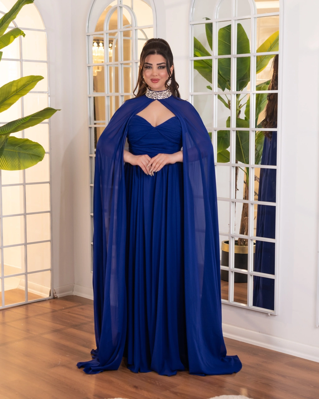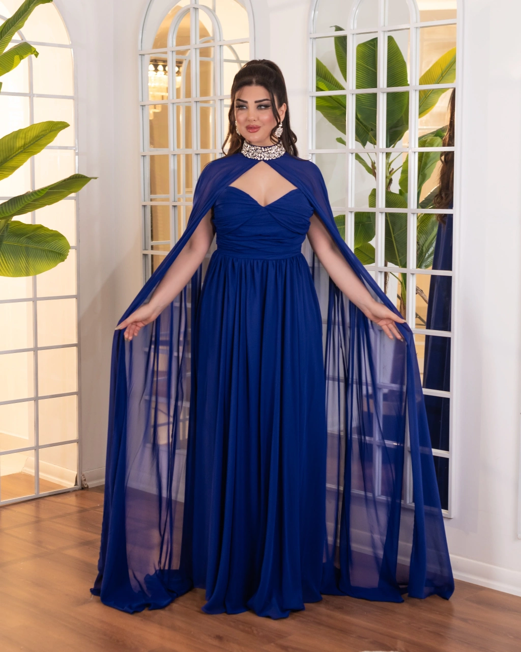 Akışkan şifon kumaştan oluşan pelerin detayı, elbiseye hareket ve asil bir siluet kazandırır. Drapeli gövde yapısı vücut hatlarını nazikçe sararak feminen bir görünüm sunar. Uzun ve dökümlü eteği sayesinde zarif ve dengeli bir duruş elde edilir.