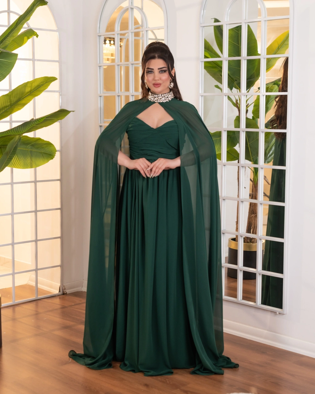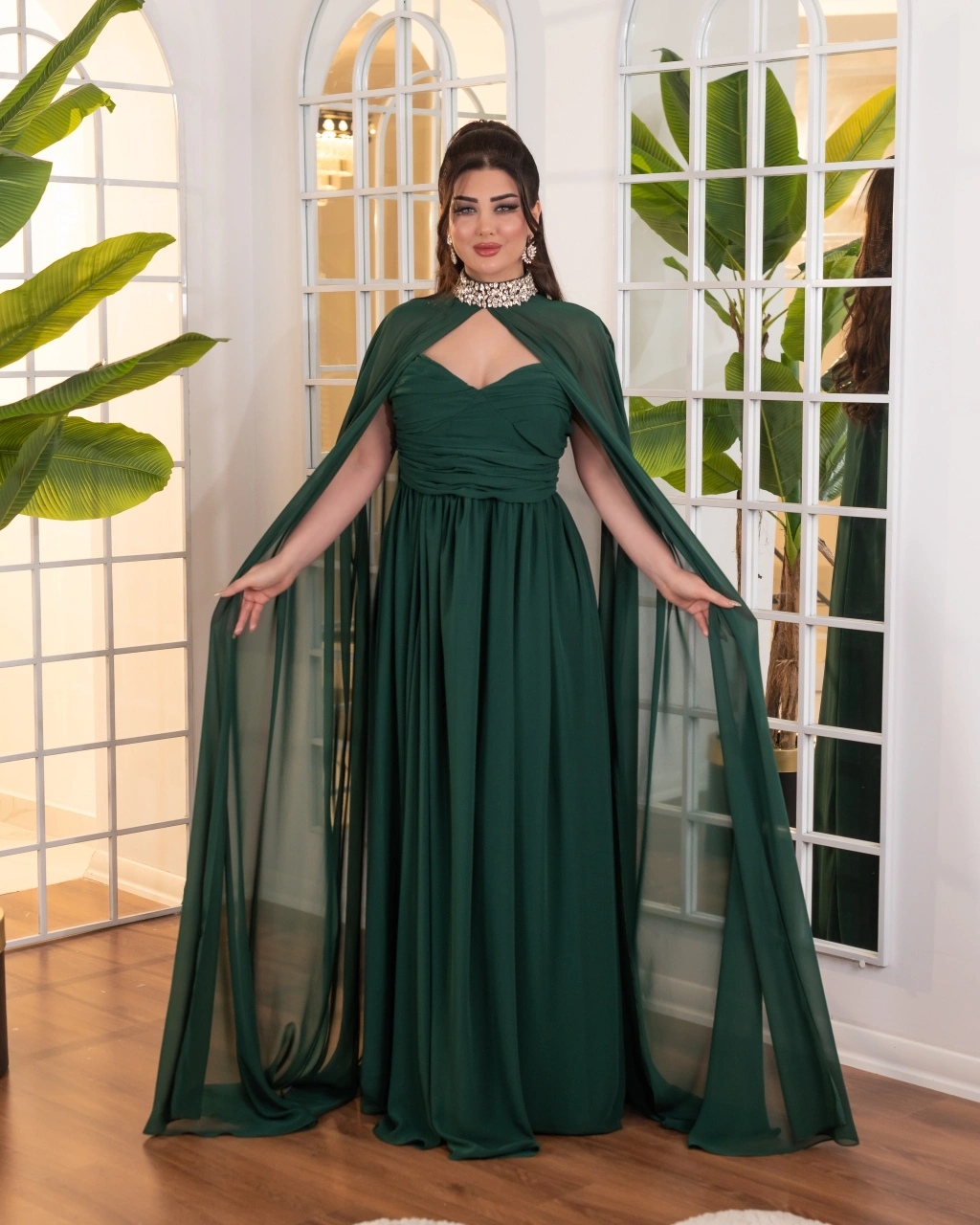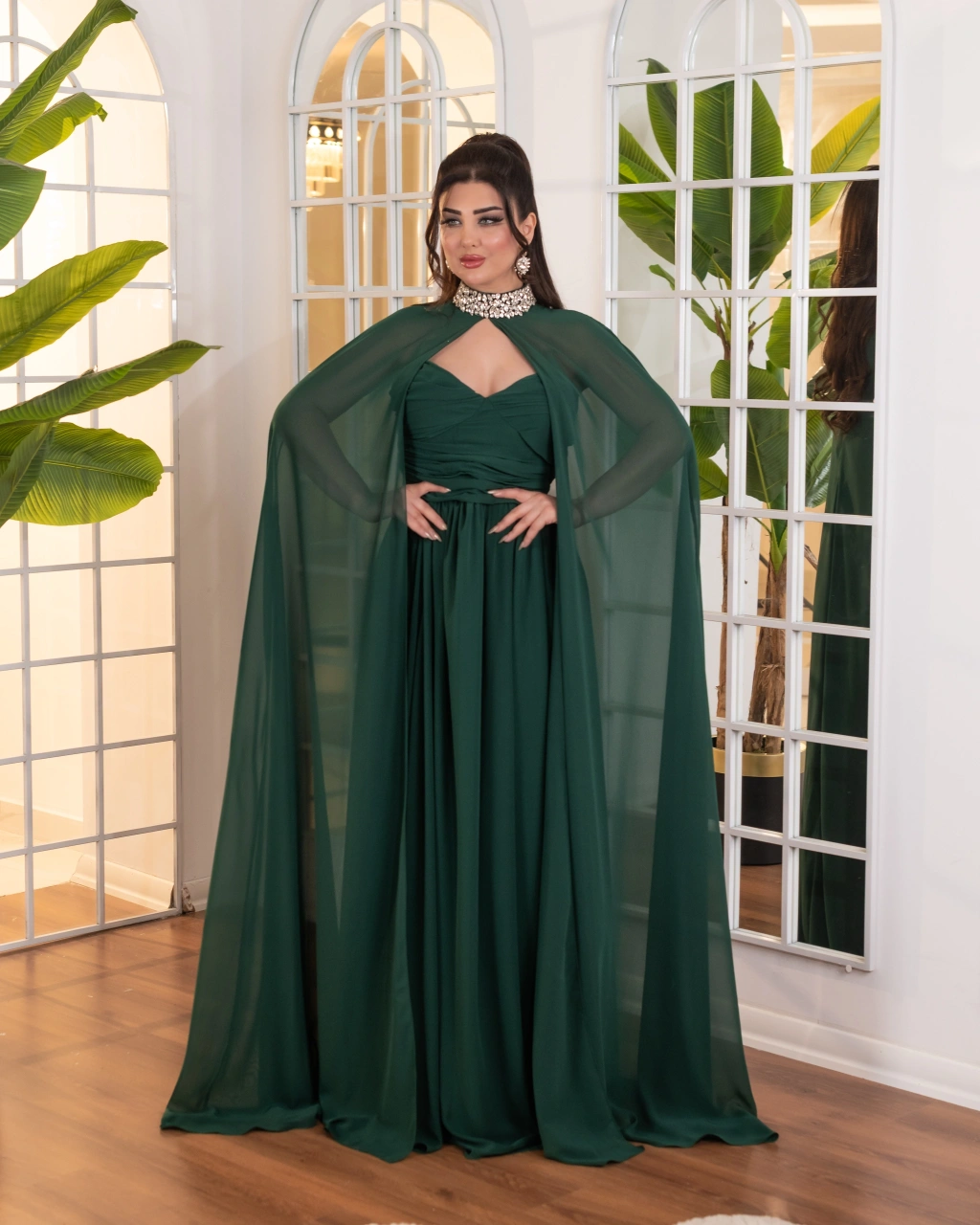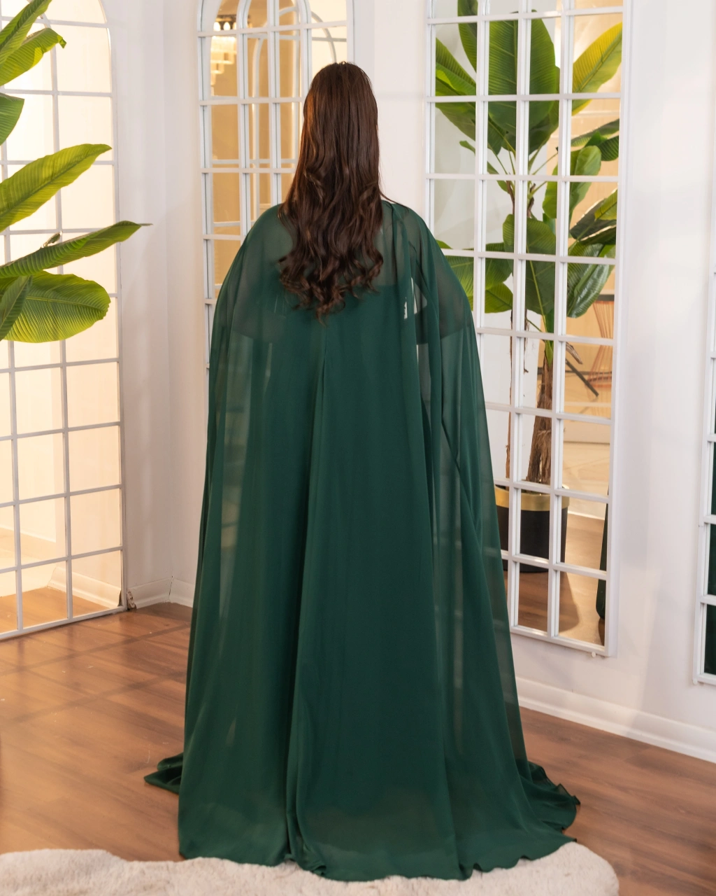 Akışkan şifon kumaştan oluşan pelerin detayı, elbiseye hareket ve asil bir siluet kazandırır. Drapeli gövde yapısı vücut hatlarını nazikçe sararak feminen bir görünüm sunar. Uzun ve dökümlü eteği sayesinde zarif ve dengeli bir duruş elde edilir.