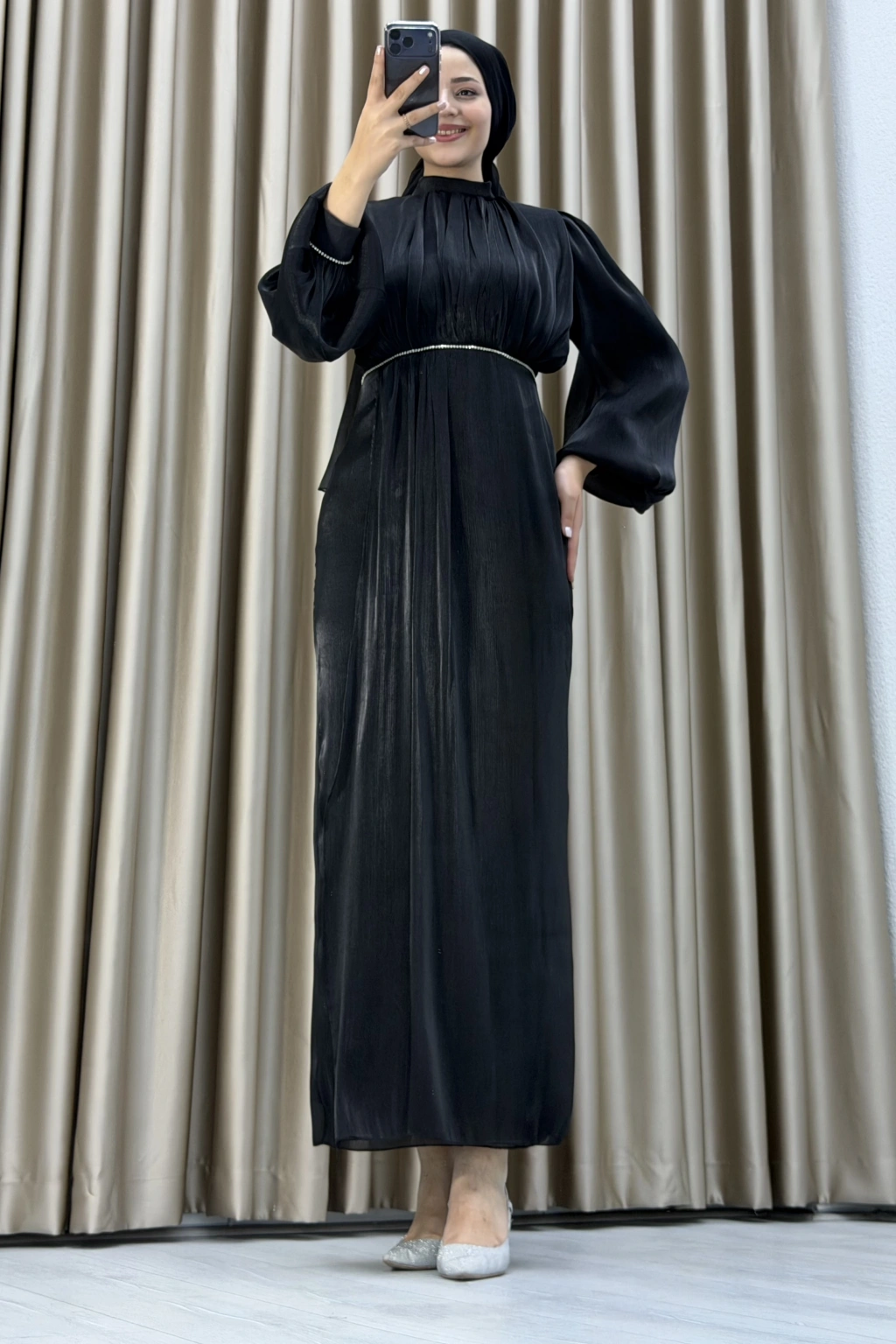 Yüksek Yaka, Bel Taş Detaylı, Uzun Kollu, Dökümlü Şifon Uzun Abiye Elbise