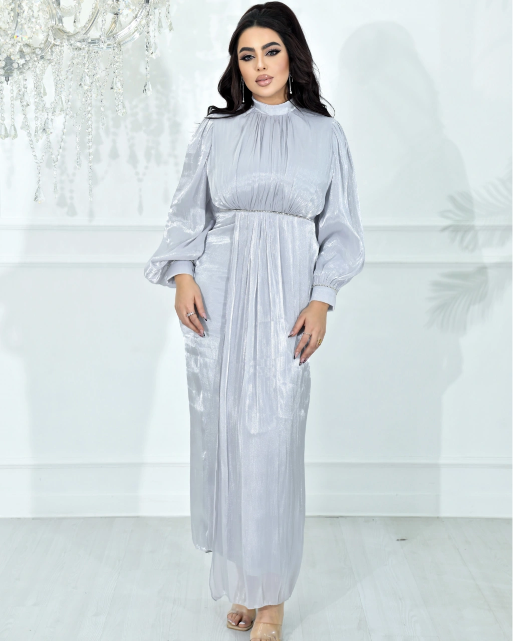 Yüksek Yaka, Bel Taş Detaylı, Uzun Kollu, Dökümlü Şifon Uzun Abiye Elbise