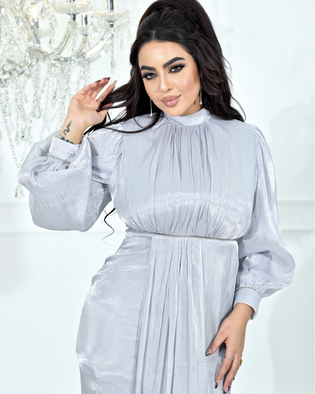 • Zarif dökümlü yapısı, yüksek yakası ve bel kısmındaki taş detayıyla özel günler için şıklığı ön plana çıkaran uzun abiye elbise.