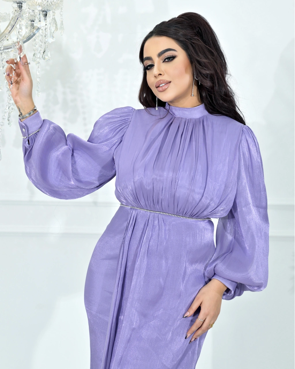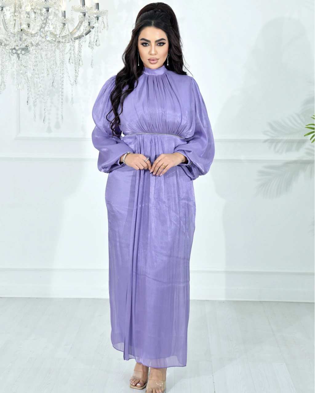 Yüksek Yaka, Bel Taş Detaylı, Uzun Kollu, Dökümlü Şifon Uzun Abiye Elbise