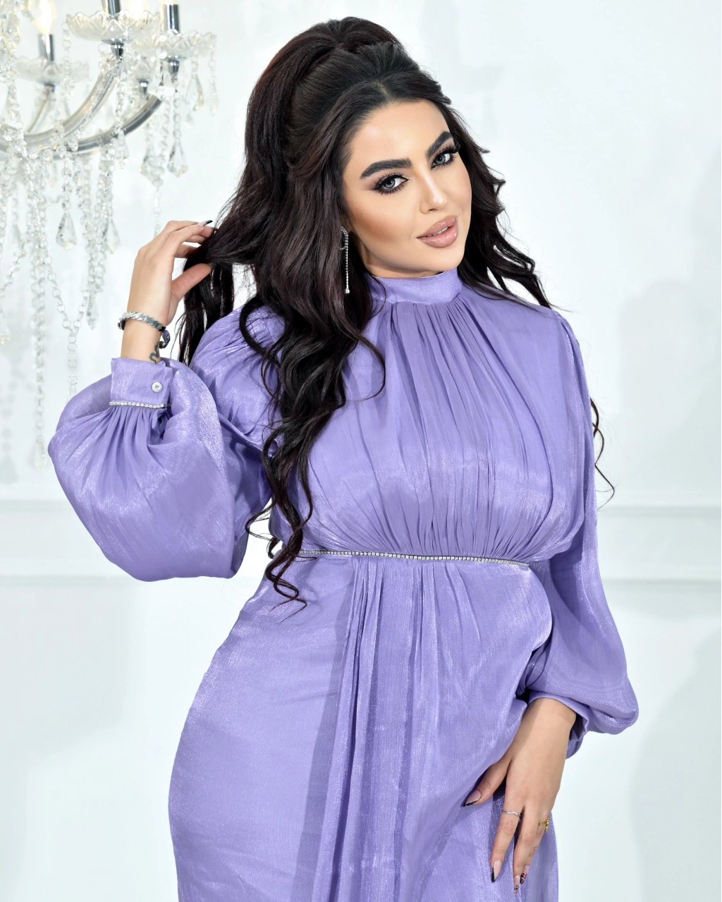 • Zarif dökümlü yapısı, yüksek yakası ve bel kısmındaki taş detayıyla özel günler için şıklığı ön plana çıkaran uzun abiye elbise.