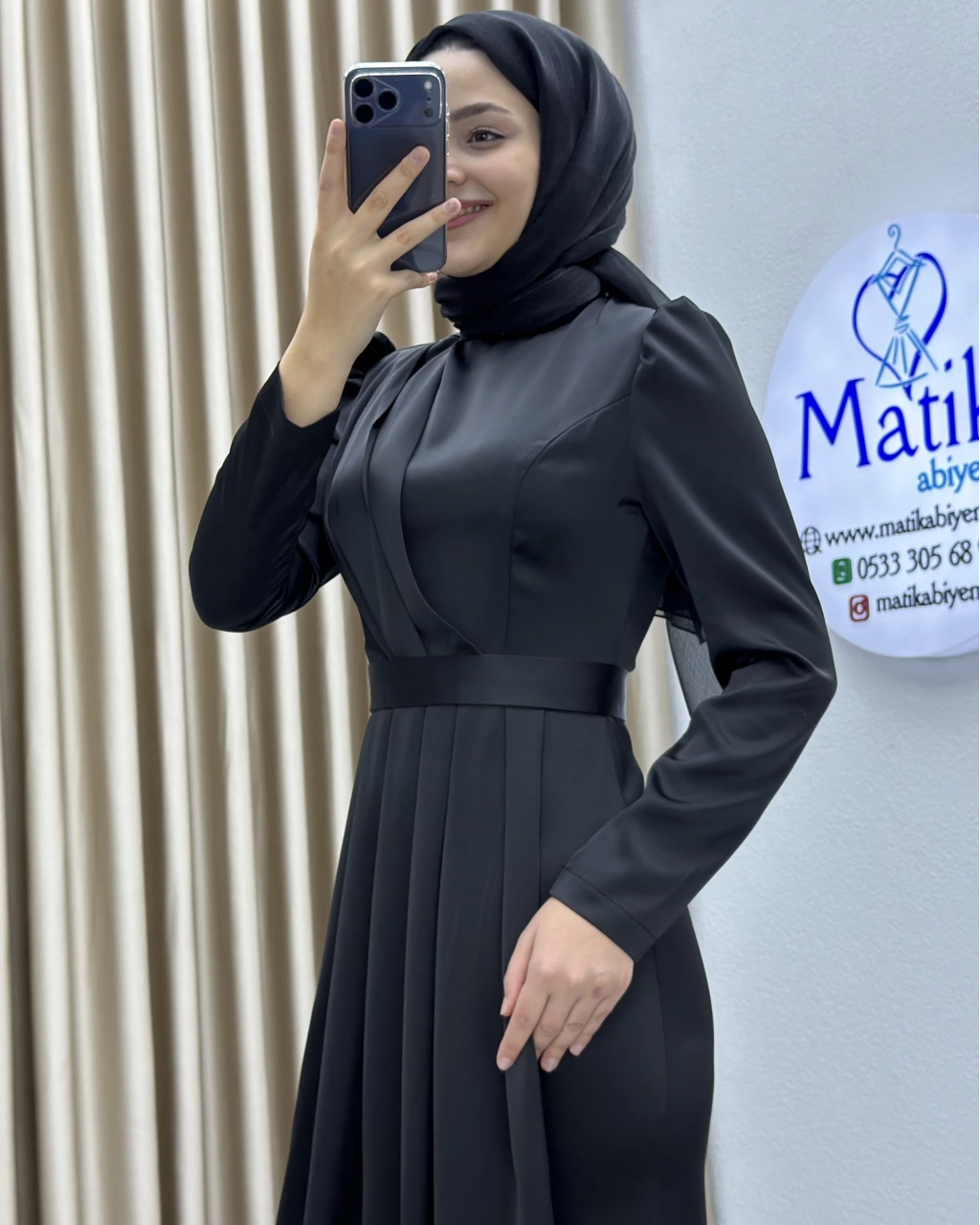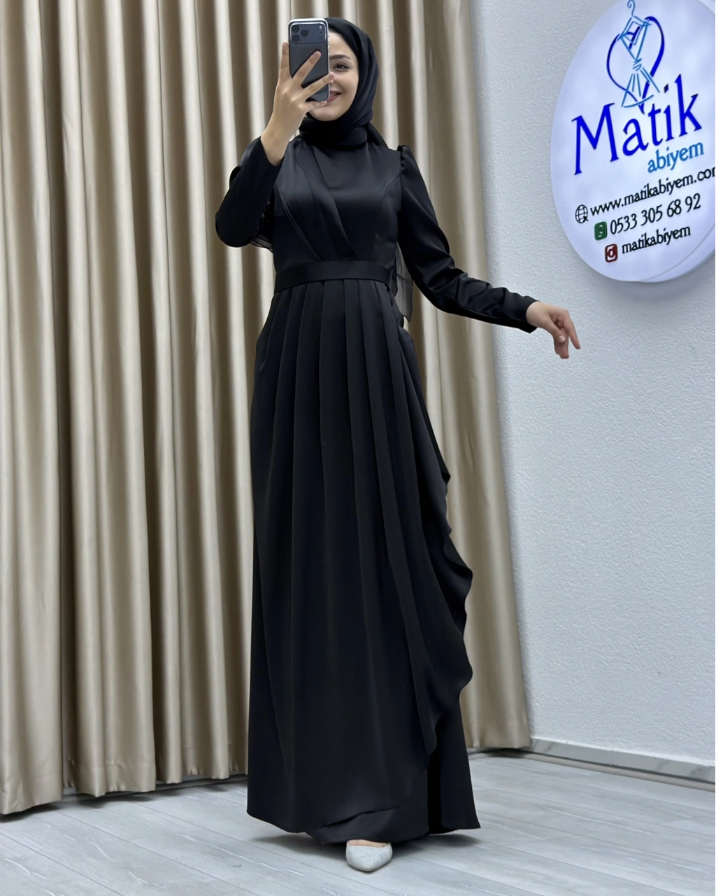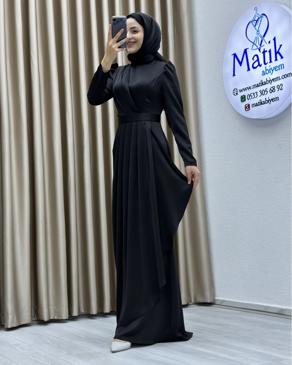 Zarif duruşu ve akışkan saten kumaşıyla öne çıkan Zara Saten Abiye, modern tasarımı ve rahat kesimiyle özel günlerde şıklığı garanti eder. Yüksek yaka, uzun kol ve beldeki drape detaylarıyla hem sade hem de etkileyici bir görünüm sunar. Nişan, söz, mezuniyet ve tüm davetler için ideal bir seçimdir.