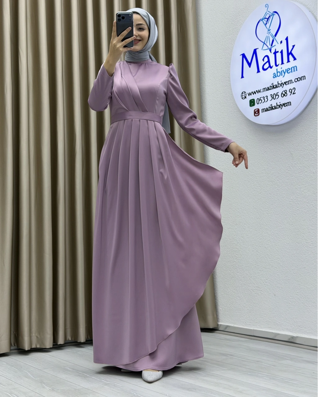 Zarif duruşu ve akışkan saten kumaşıyla öne çıkan Zara Saten Abiye, modern tasarımı ve rahat kesimiyle özel günlerde şıklığı garanti eder. Yüksek yaka, uzun kol ve beldeki drape detaylarıyla hem sade hem de etkileyici bir görünüm sunar. Nişan, söz, mezuniyet ve tüm davetler için ideal bir seçimdir.