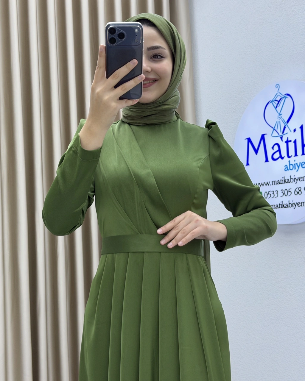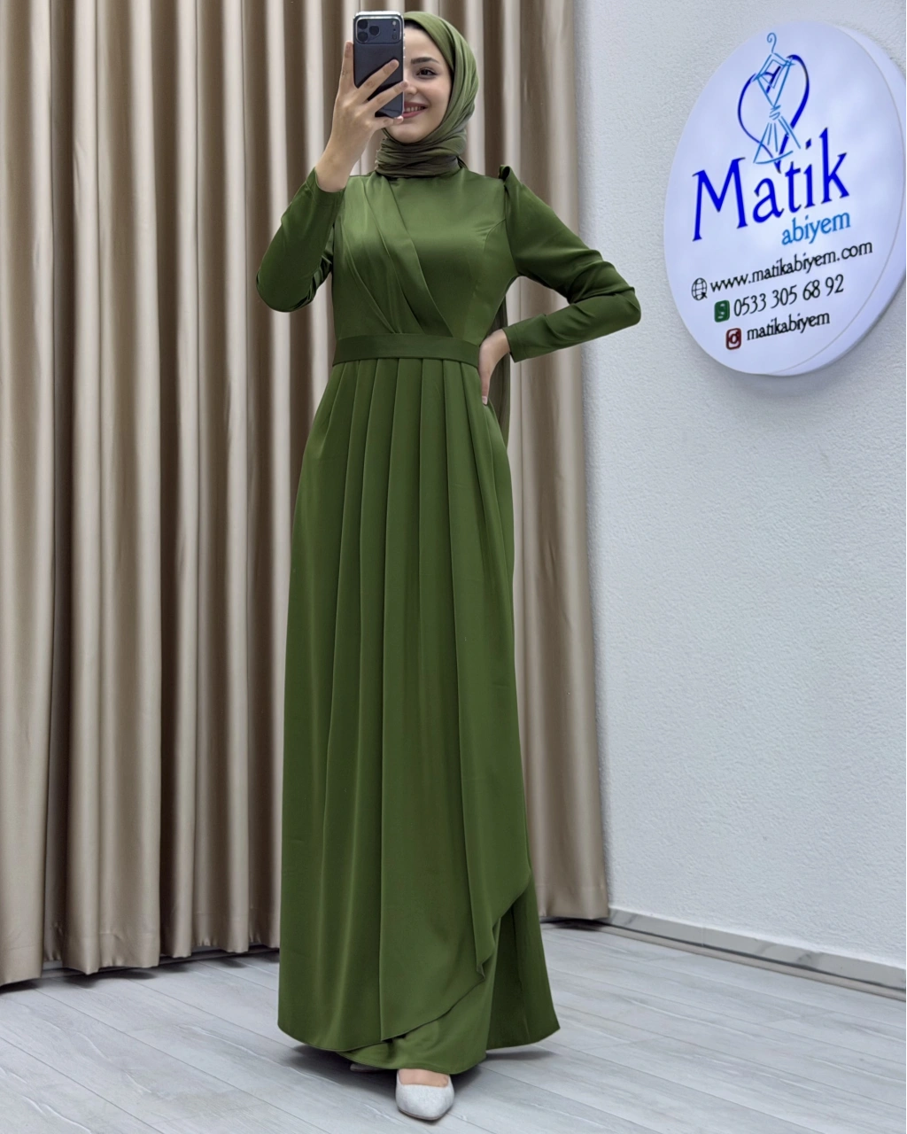 Zarif duruşu ve akışkan saten kumaşıyla öne çıkan Zara Saten Abiye, modern tasarımı ve rahat kesimiyle özel günlerde şıklığı garanti eder. Yüksek yaka, uzun kol ve beldeki drape detaylarıyla hem sade hem de etkileyici bir görünüm sunar. Nişan, söz, mezuniyet ve tüm davetler için ideal bir seçimdir.