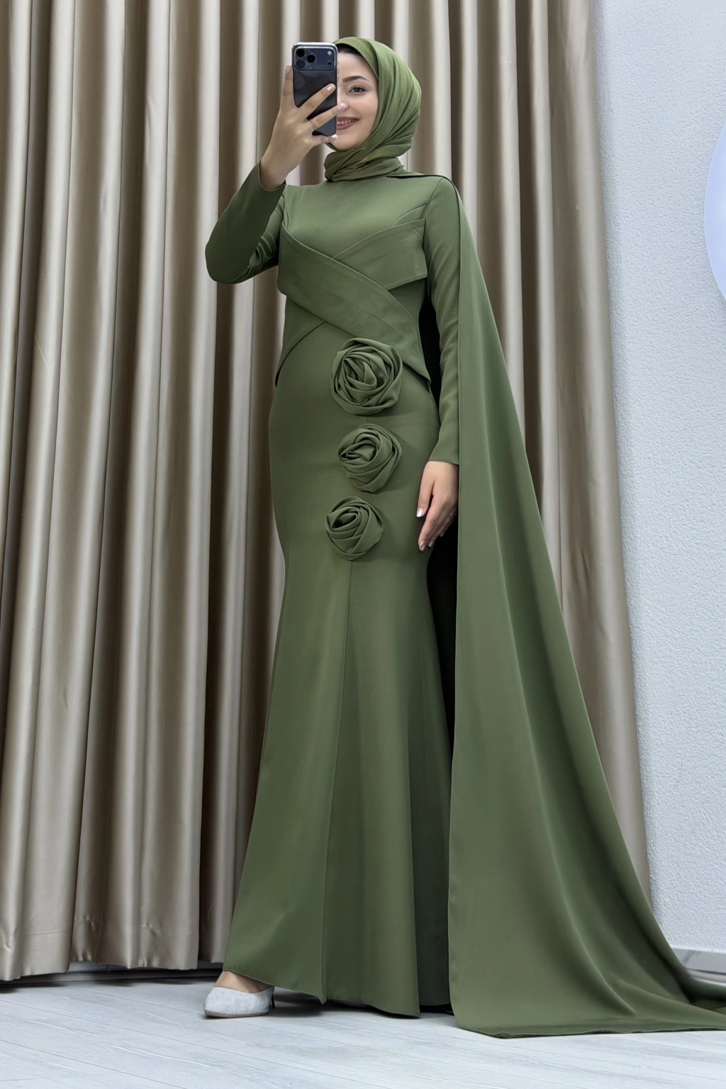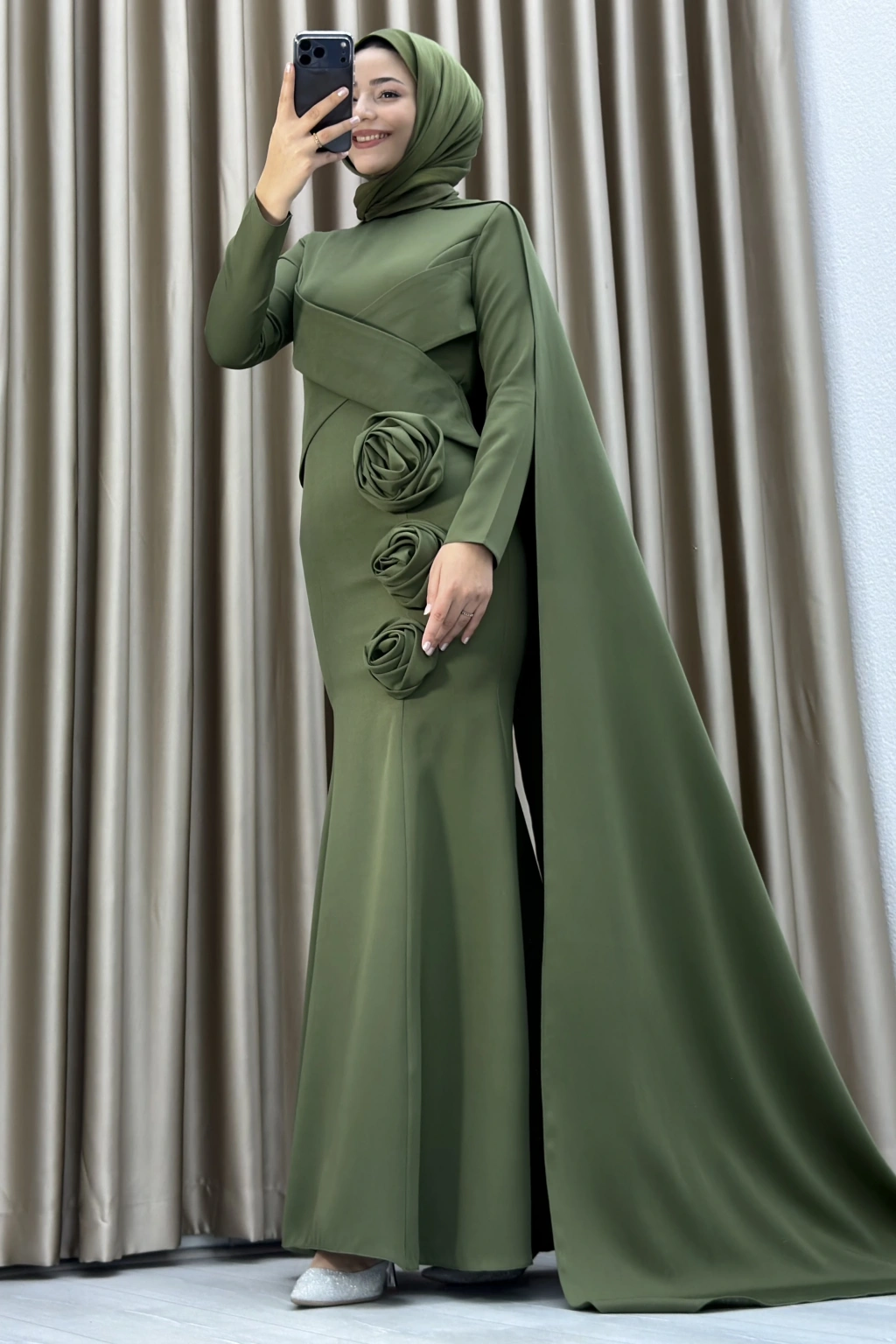 • Modern çizgilere sahip drapeli tasarımı, kuyruklu şık formu ve üç boyutlu gül detaylarıyla öne çıkan zarif tesettür abiye. Nişan, söz, kına ve özel davetler için ideal tercihtir.