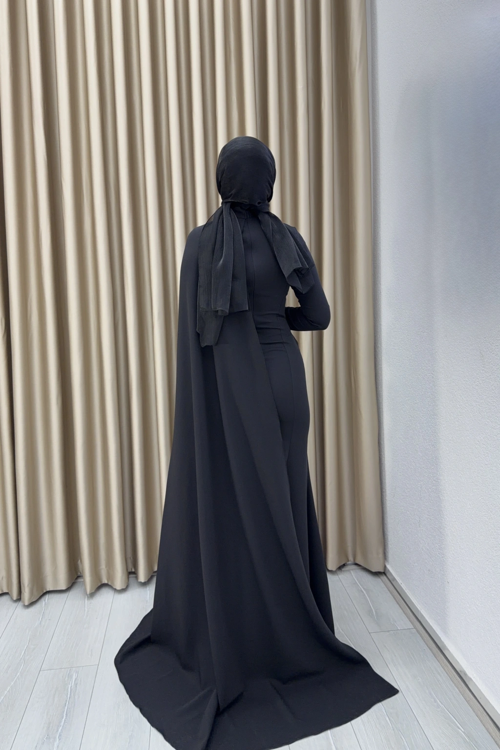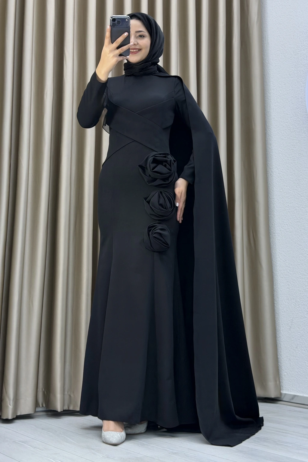 Sofistike tasarımıyla dikkat çeken bu tesettür abiye, modern dokunuşlarla hazırlanmış özel bir modeldir. Vücudu zarifçe saran kesimi ve ön bölümde çapraz şekilde kullanılan drapeler, elbiseye güçlü bir duruş kazandırırken; etek kısmında yer alan üç boyutlu gül detayları feminen ve sanatsal bir görünüm sunar.