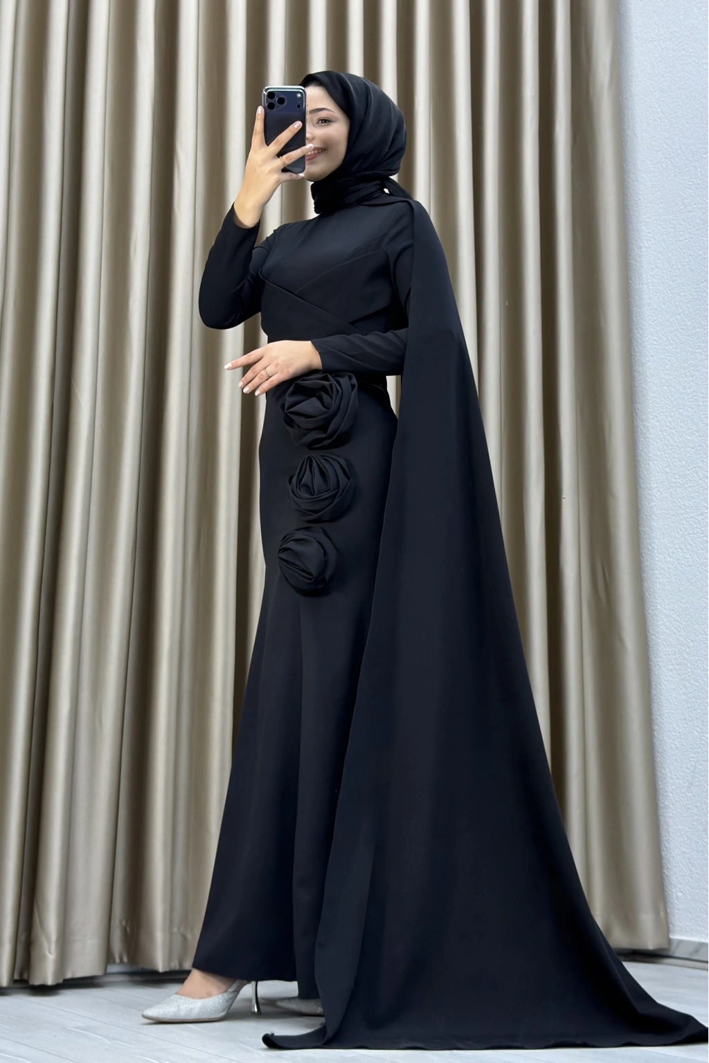 • Modern çizgilere sahip drapeli tasarımı, kuyruklu şık formu ve üç boyutlu gül detaylarıyla öne çıkan zarif tesettür abiye. Nişan, söz, kına ve özel davetler için ideal tercihtir.