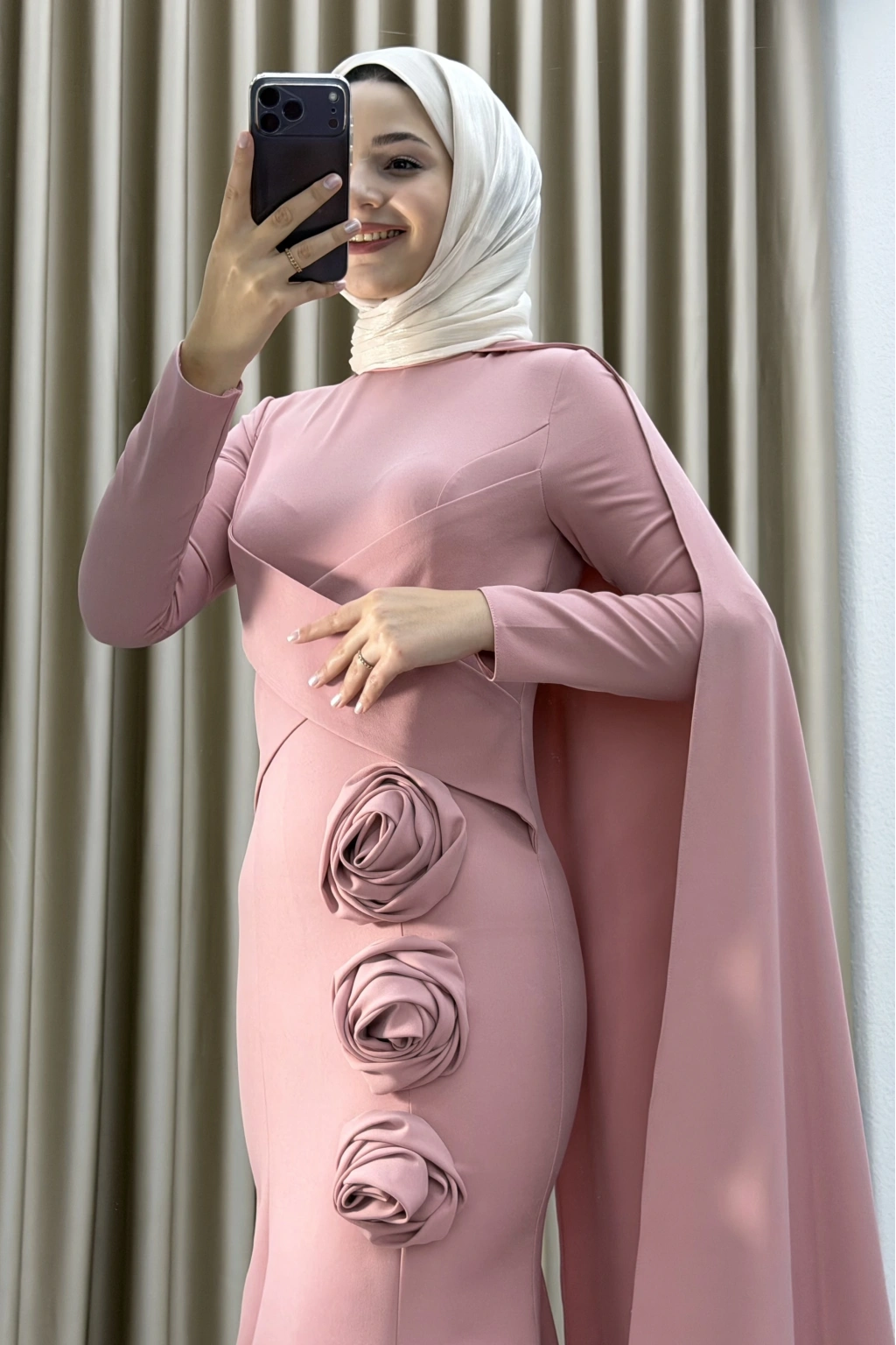 Sofistike tasarımıyla dikkat çeken bu tesettür abiye, modern dokunuşlarla hazırlanmış özel bir modeldir. Vücudu zarifçe saran kesimi ve ön bölümde çapraz şekilde kullanılan drapeler, elbiseye güçlü bir duruş kazandırırken; etek kısmında yer alan üç boyutlu gül detayları feminen ve sanatsal bir görünüm sunar.