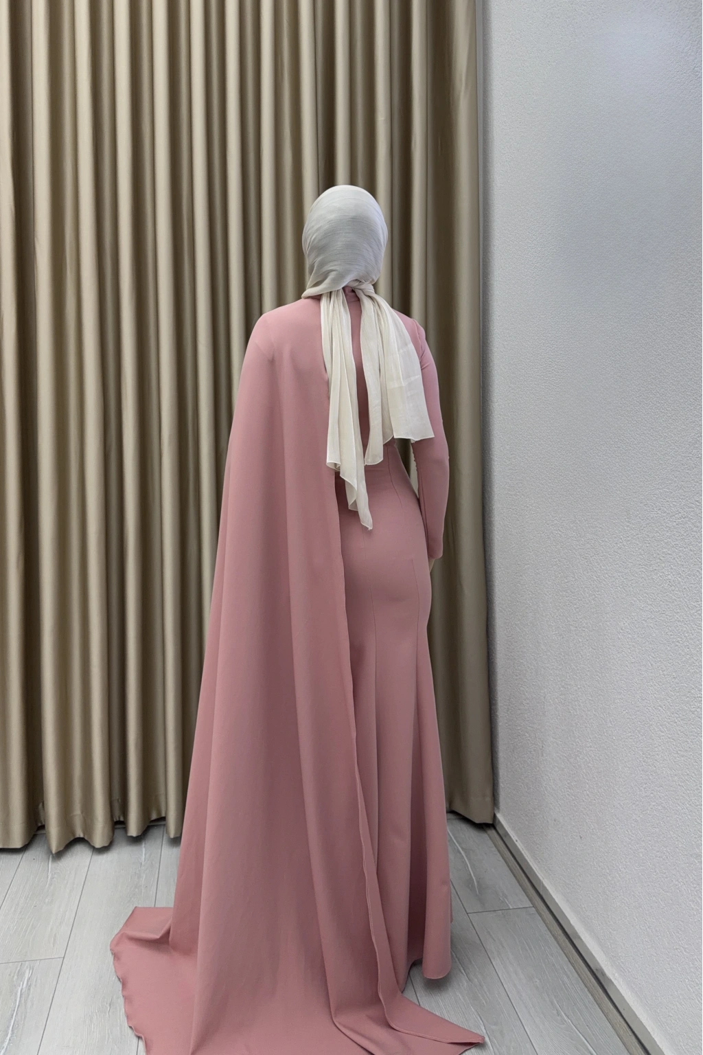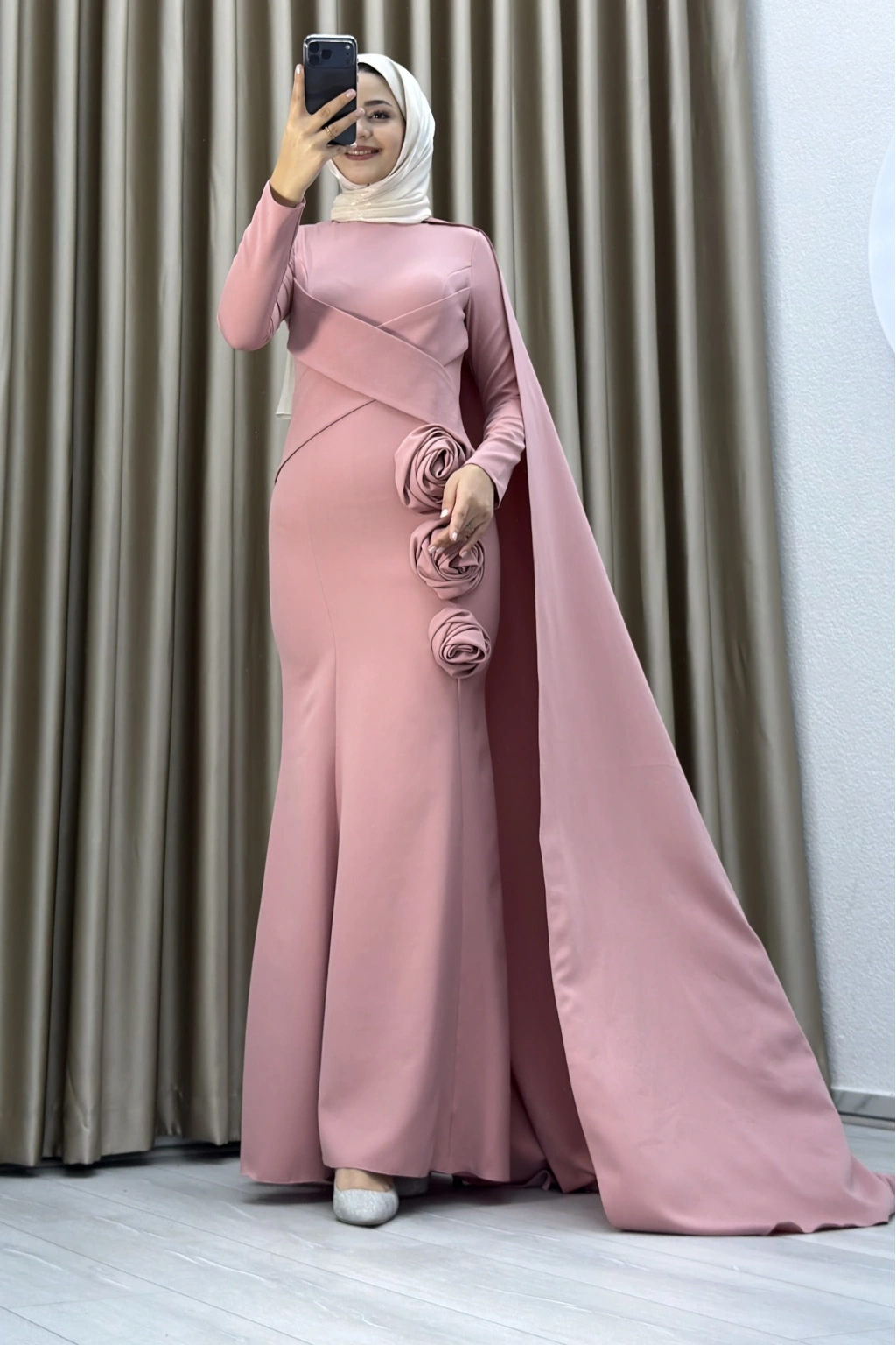 • Modern çizgilere sahip drapeli tasarımı, kuyruklu şık formu ve üç boyutlu gül detaylarıyla öne çıkan zarif tesettür abiye. Nişan, söz, kına ve özel davetler için ideal tercihtir.