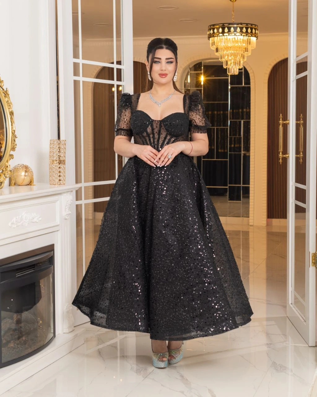 Zarif Işıltılı Tül Etekli, Korse Detaylı, Balon Kol Özel Tasarım Midi Gelinlik / Abiye Elbise