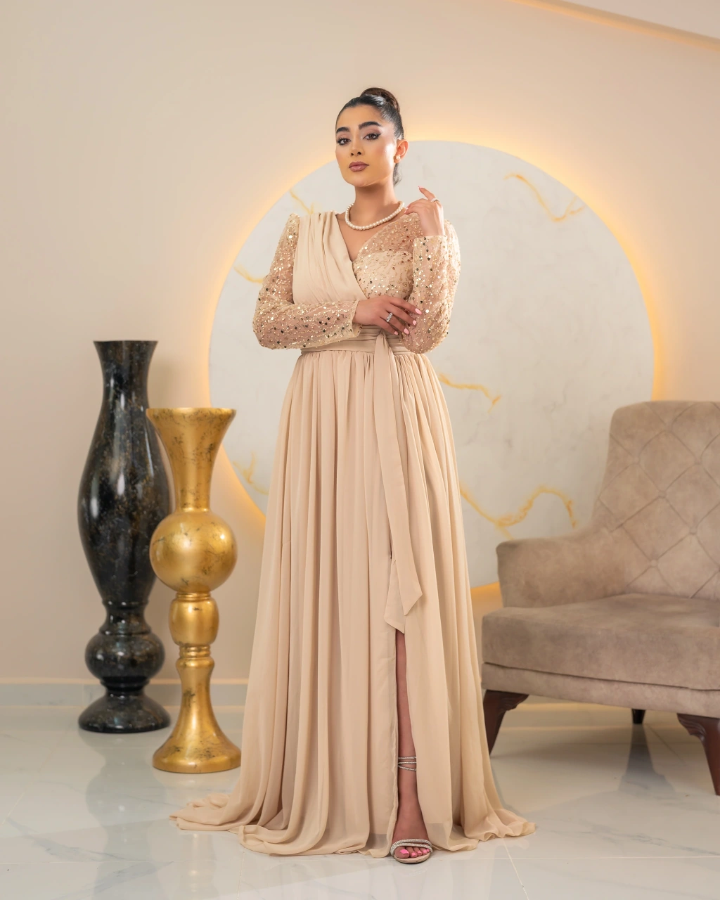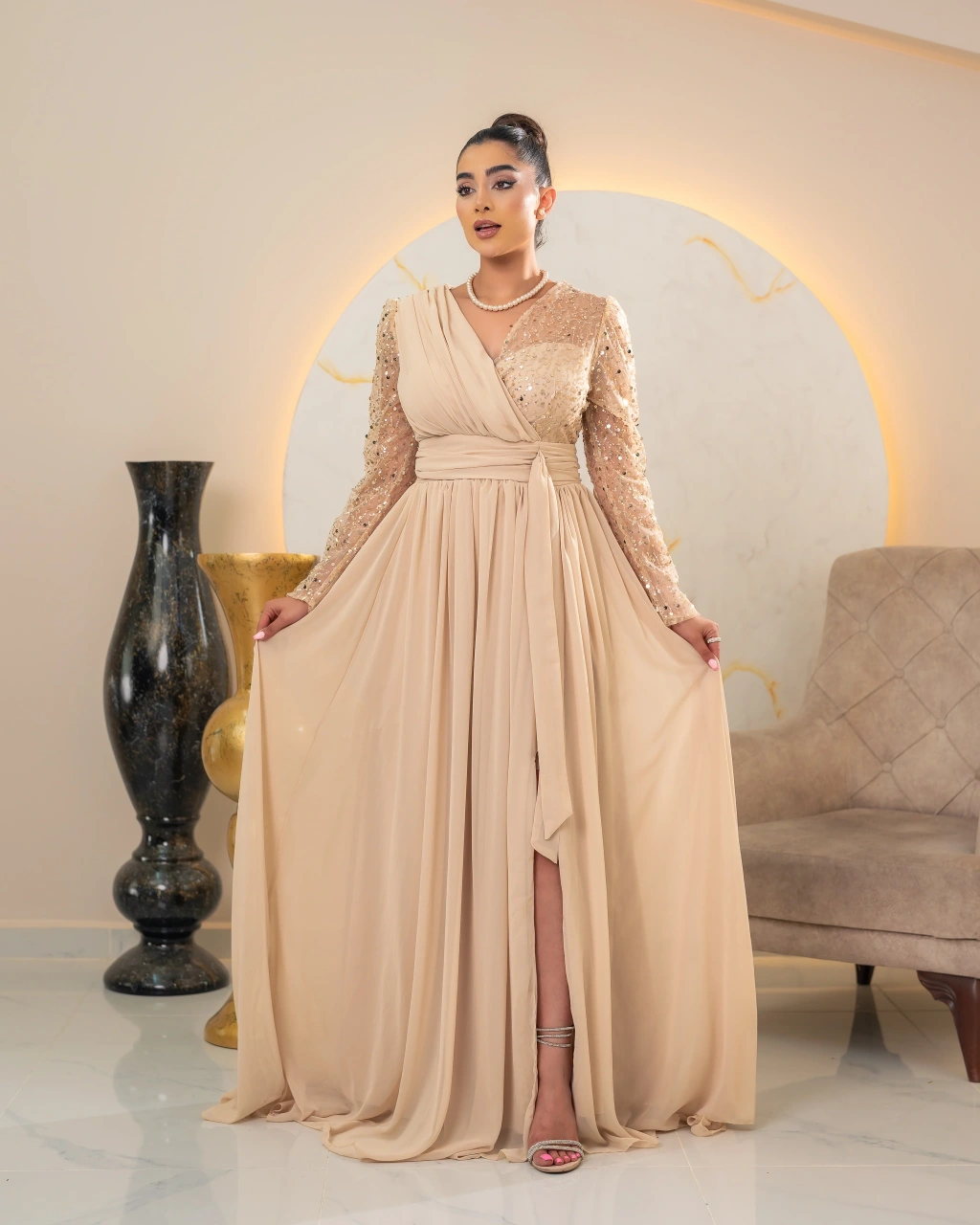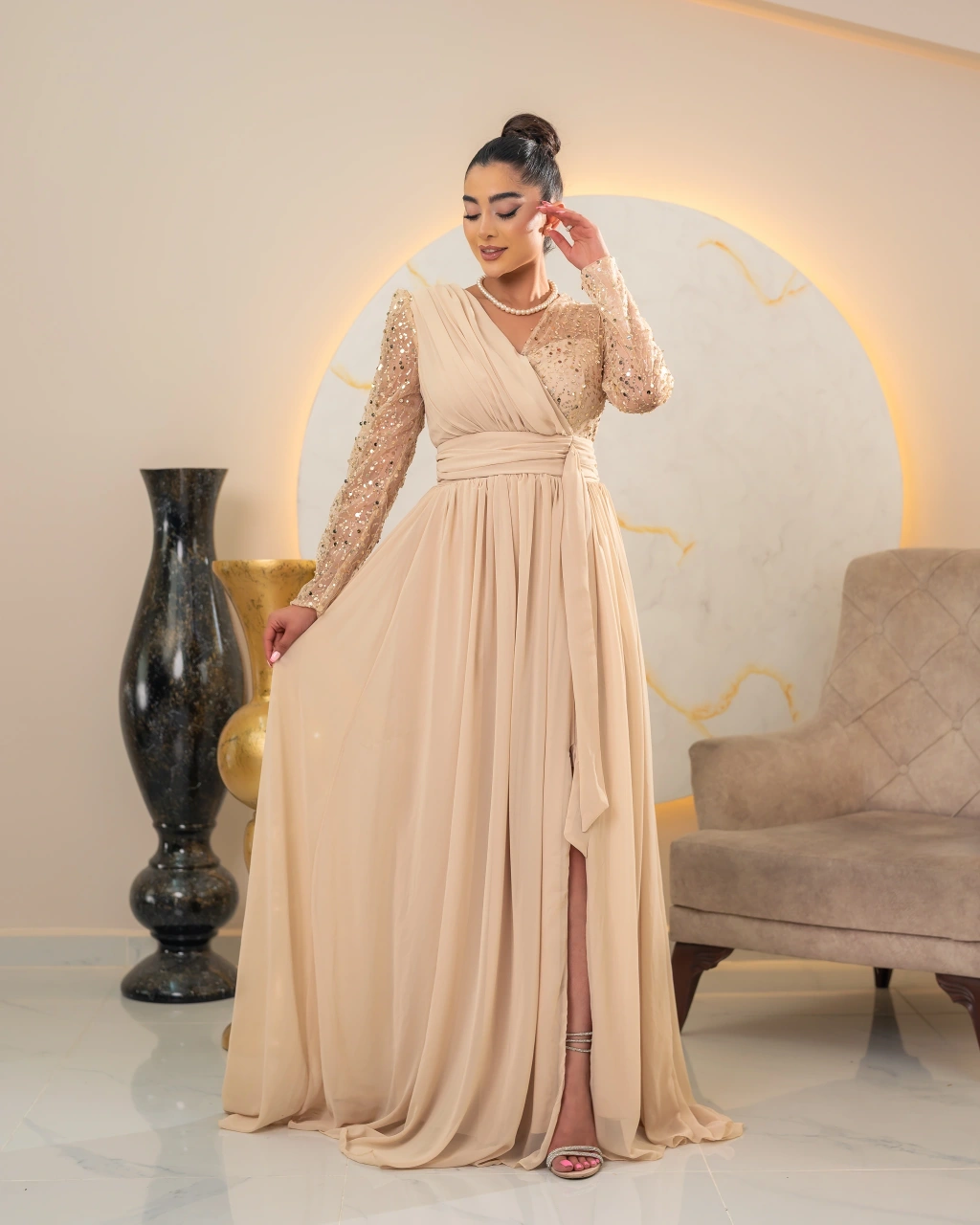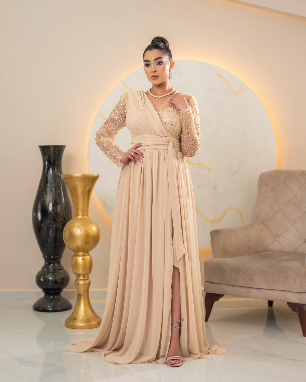 Zarif Sırt Dekolteli, Simli Detaylı ve Yırtmaçlı Uzun Elbise Abiye – Özel Davetler İçin Şık ve Modern Tasarım