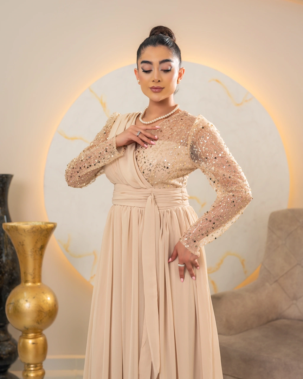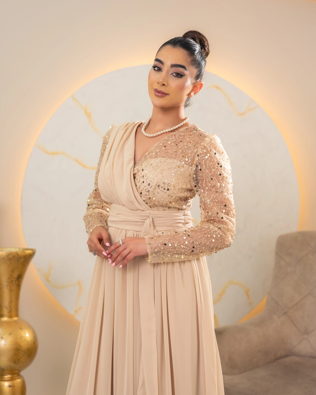 • Şıklığı ve zarafetiyle göz kamaştıran, sırt dekolteli ve simli detaylara sahip uzun elbise. Davetlerde ve özel günlerde mükemmel bir tercih.