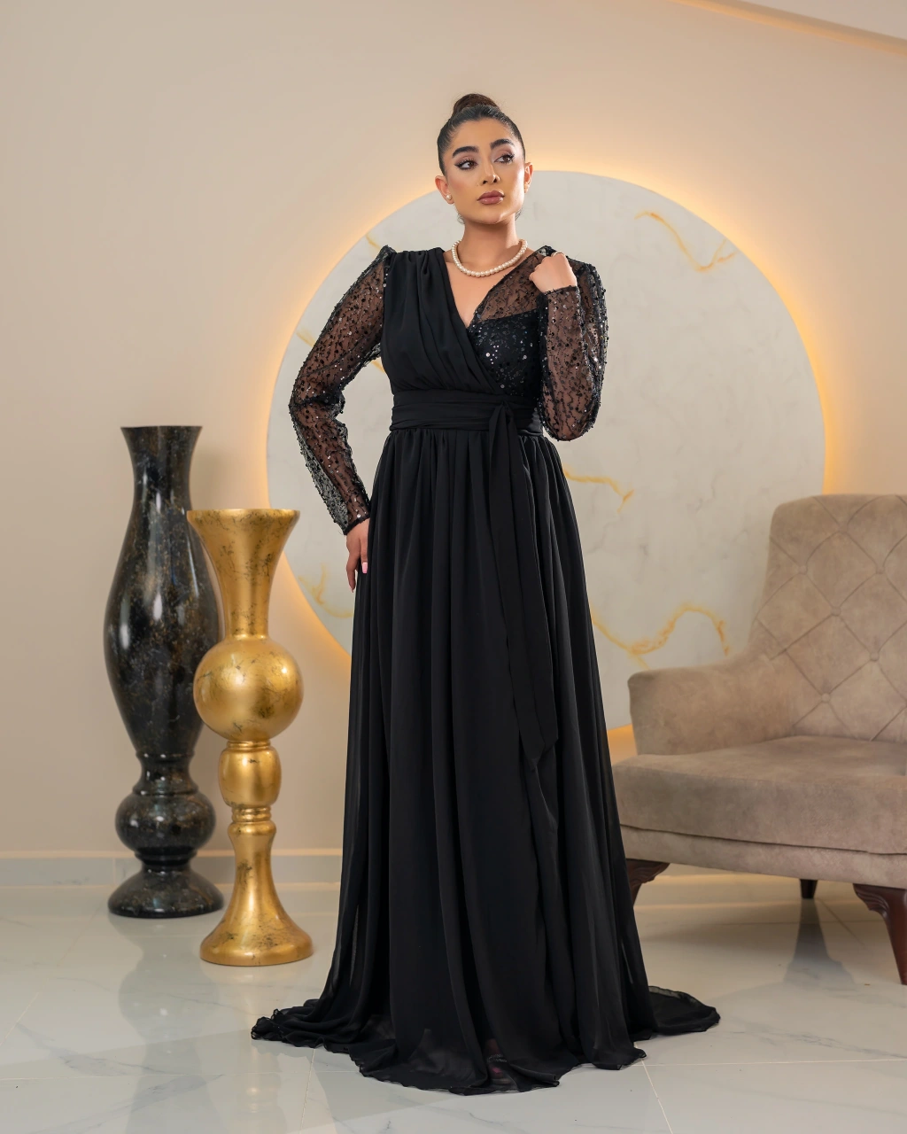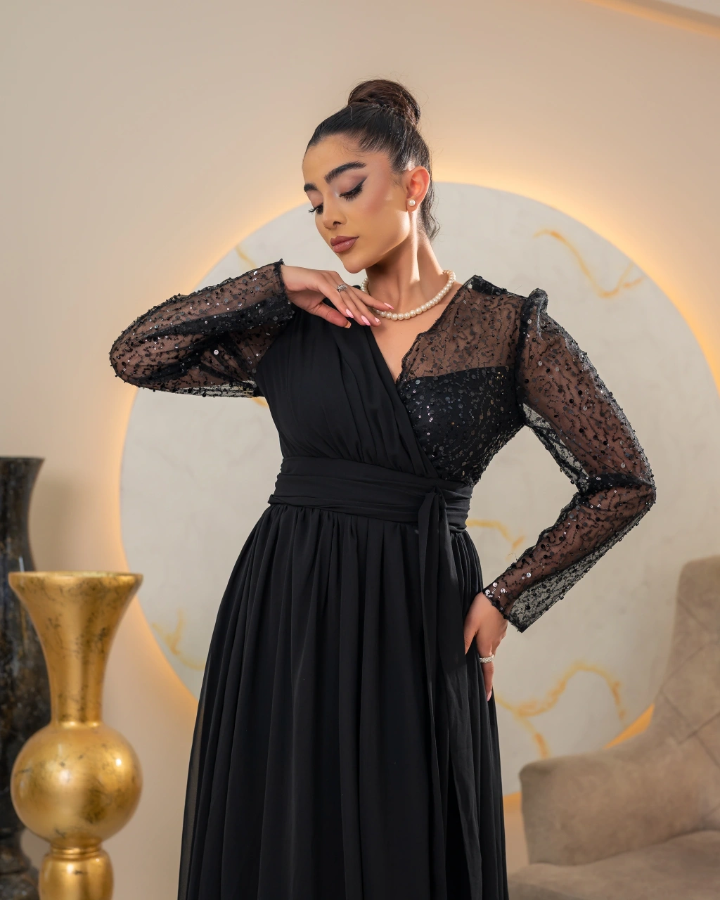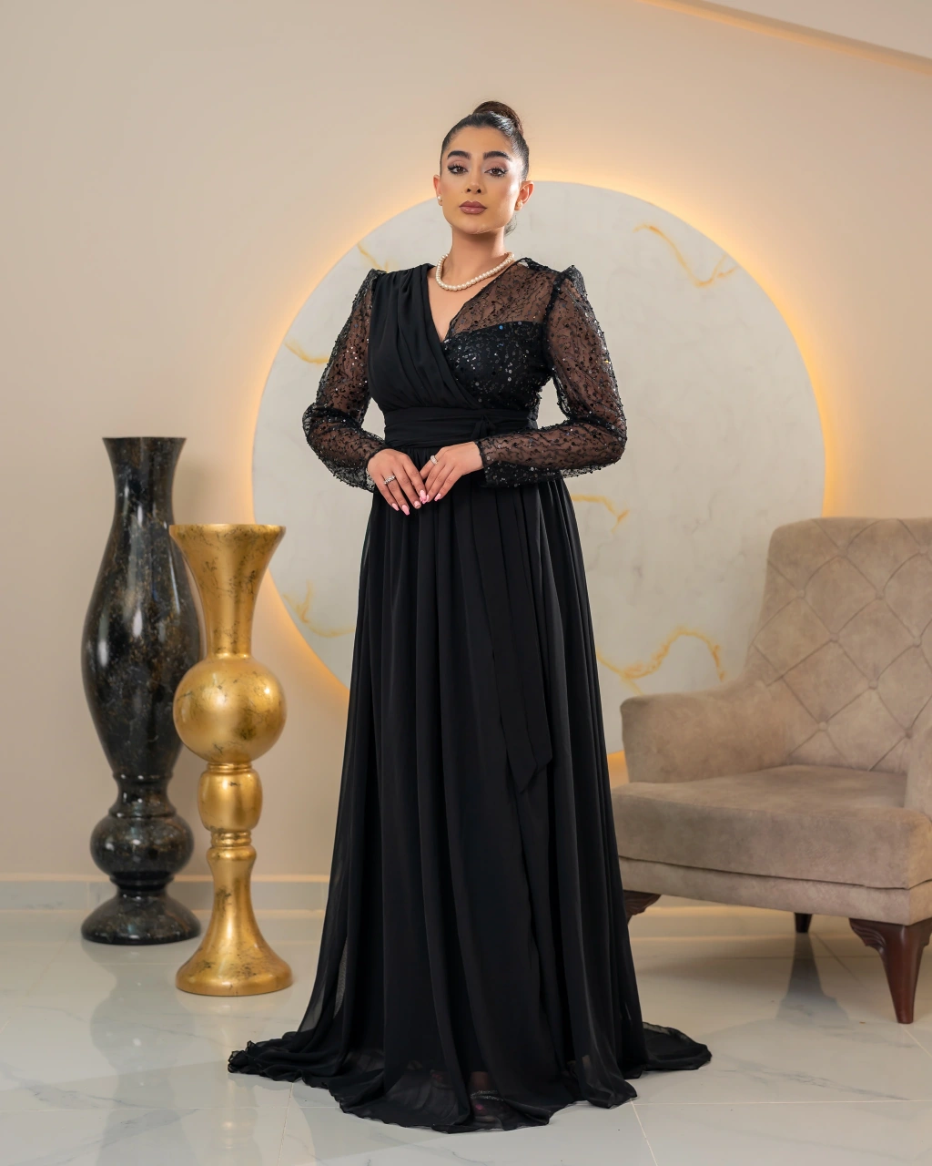 • Şıklığı ve zarafetiyle göz kamaştıran, sırt dekolteli ve simli detaylara sahip uzun elbise. Davetlerde ve özel günlerde mükemmel bir tercih.