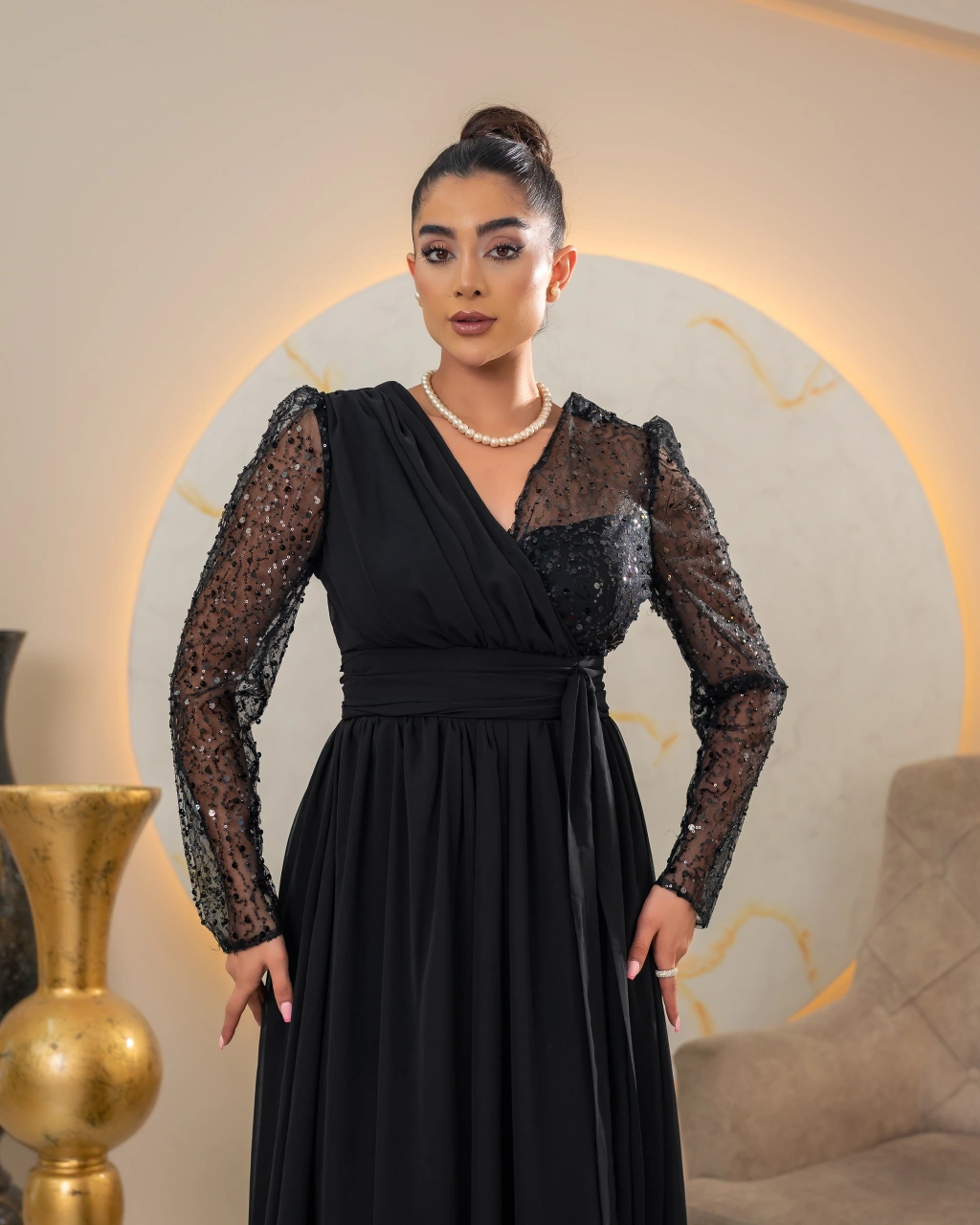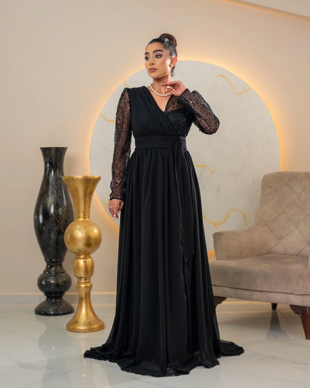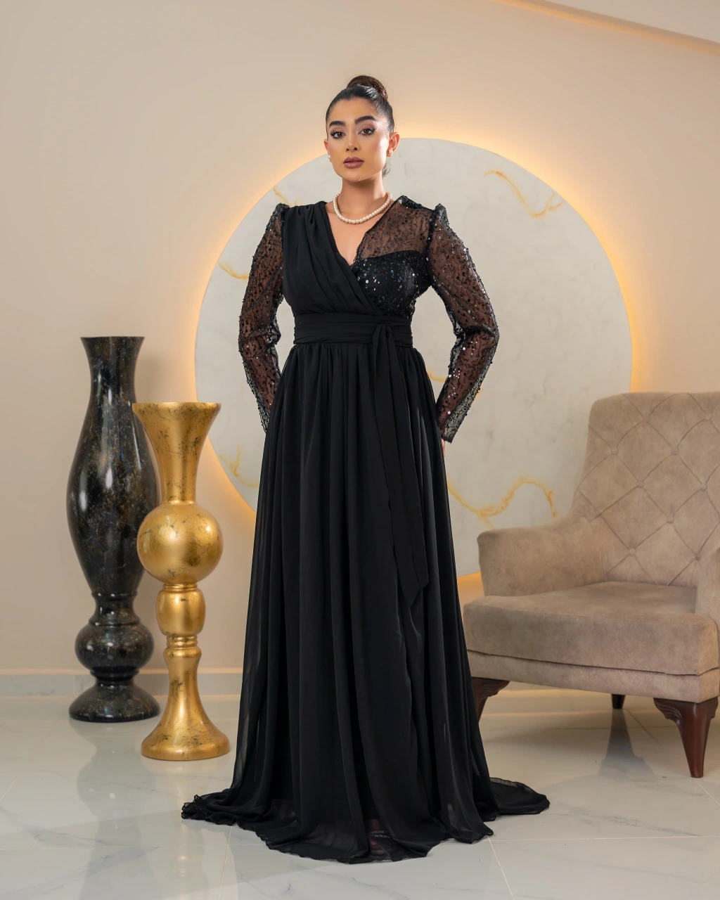 • Şıklığı ve zarafetiyle göz kamaştıran, sırt dekolteli ve simli detaylara sahip uzun elbise. Davetlerde ve özel günlerde mükemmel bir tercih.